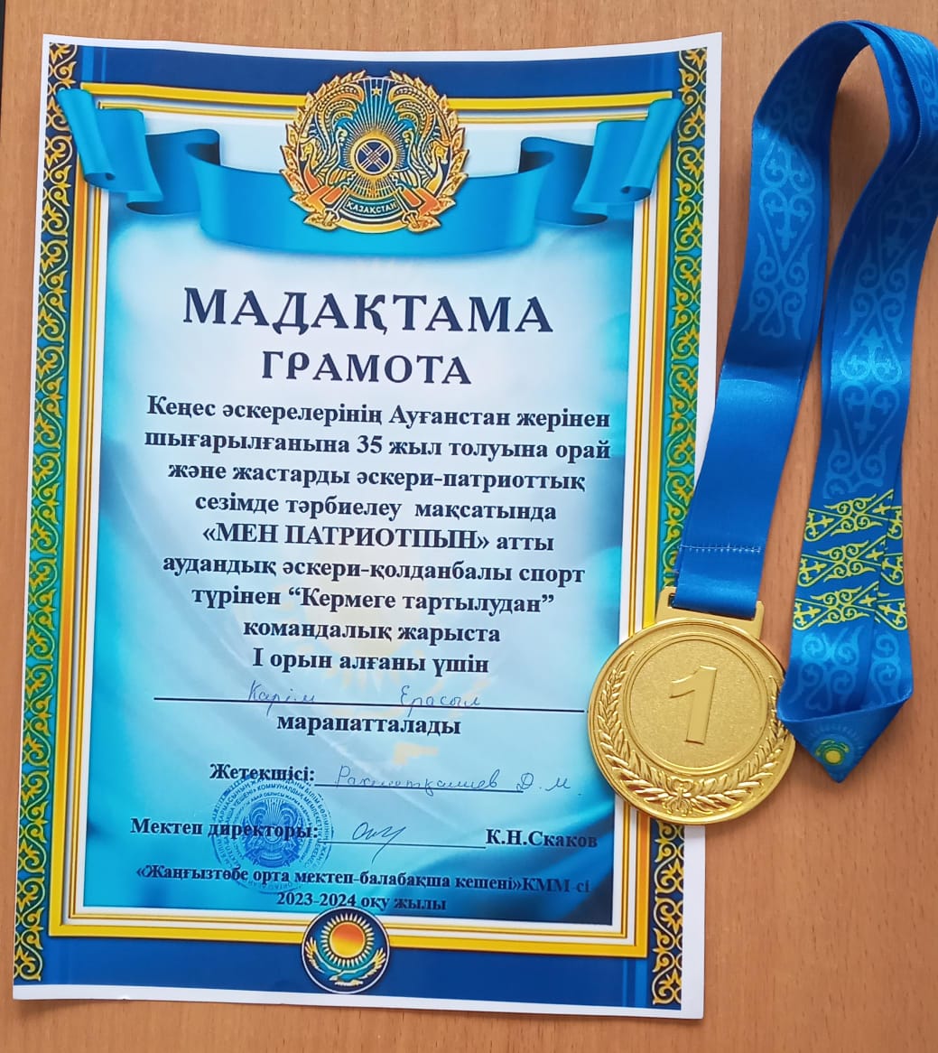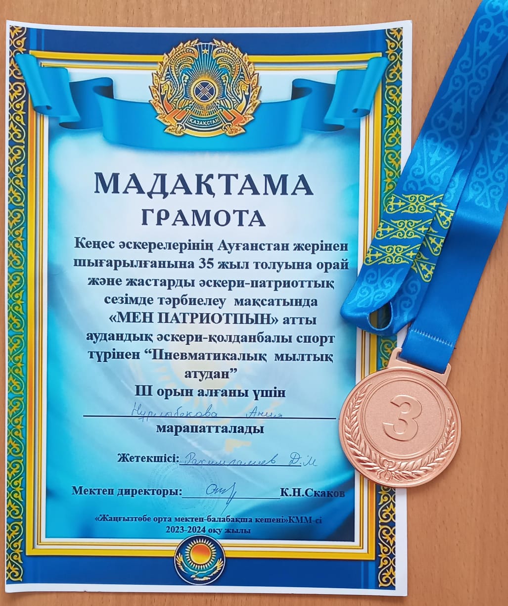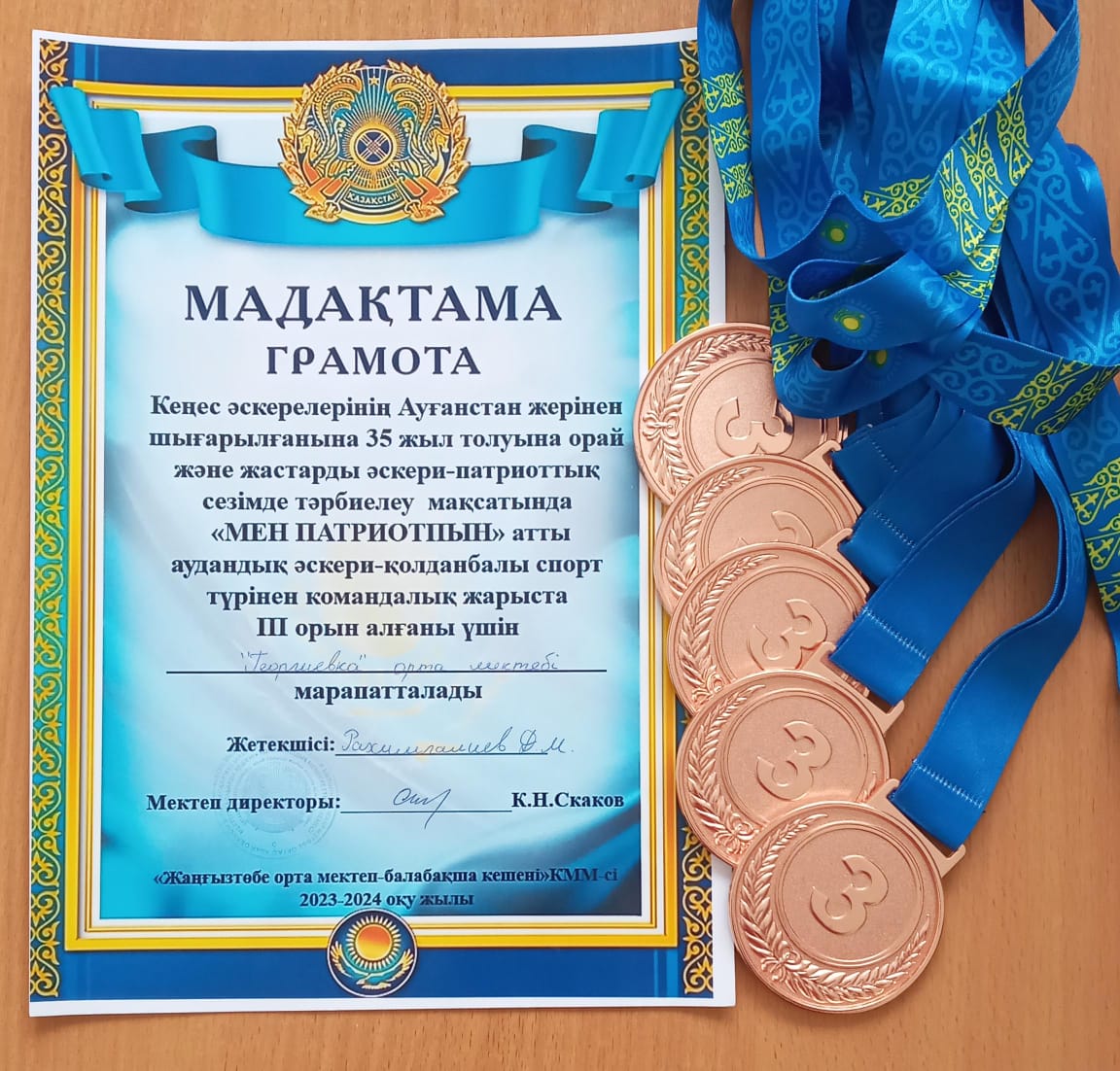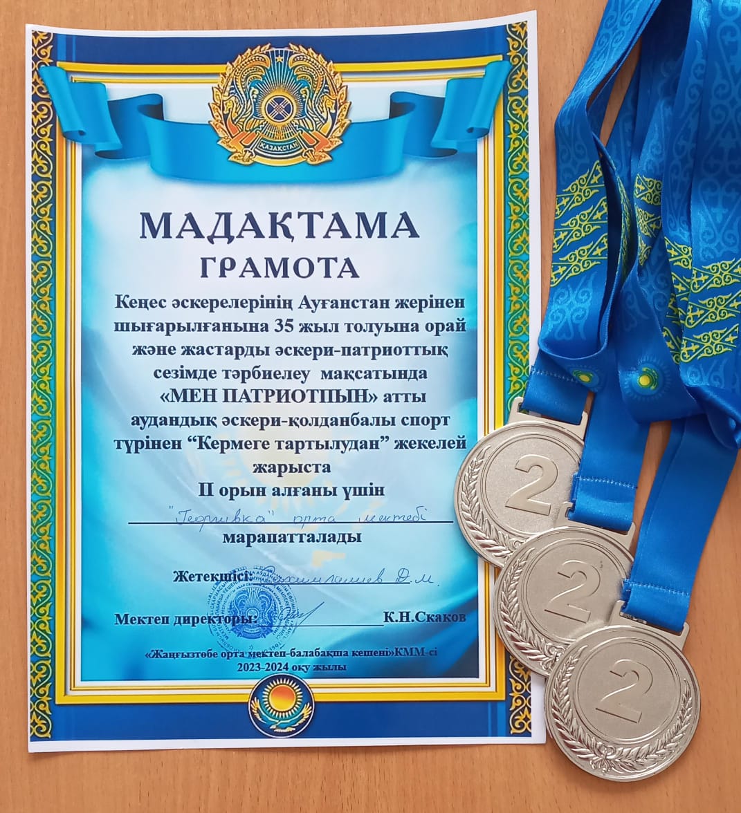 Кеңес әскерлерінің Ауғанстан жерінен шығарылғанына 35 жыл толуына орай және жастарды әскери-патриоттық сезімде тәрбиелеу мақсатында «Мен патриотпын» атты аудандық әскери-қолданбалы спорт түрі сайысында мектебіміздің оқушылары Нурлубекова Ания "Пневматикалық мылтық атудан" ІІІ орынды, Кәрім Ерасыл "Кермеге тартылудан" жекелей жарыста І орынды жеңіп алып, "Кермеге тартылудан" командалық есепте ІІ орынды иеленсе, жалпыкомандалық есепте "Георгиевка орта мектебі" КММ ІІІ орын иегері атанды. Жетекшісі Рахимгалиев Д.М.