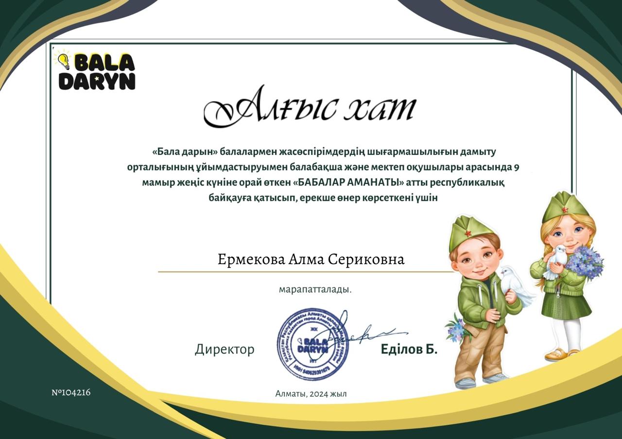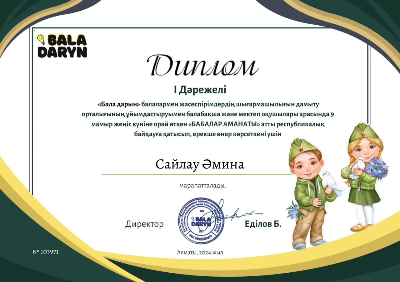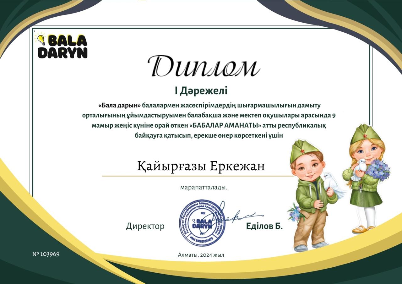 "Бала дарын" балалар мен жасөспірімдердің шығармашылығын дамыту орталығының ұйымдастыруымен 9 мамыр - Жеңіс күніне орай өткен "Балалар аманаты" атты республикалық байқауға оқушыларымыз қатысып, ерекше өнер көрсетіп, төменде аталған оқушыларымыз жүлделі І орын диплом иегері атанды.