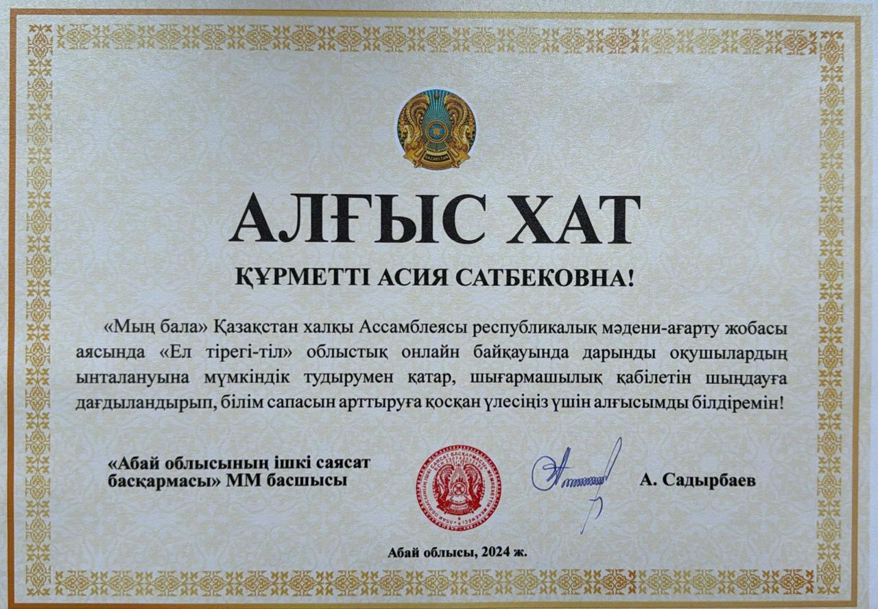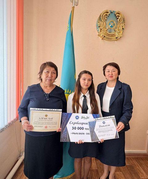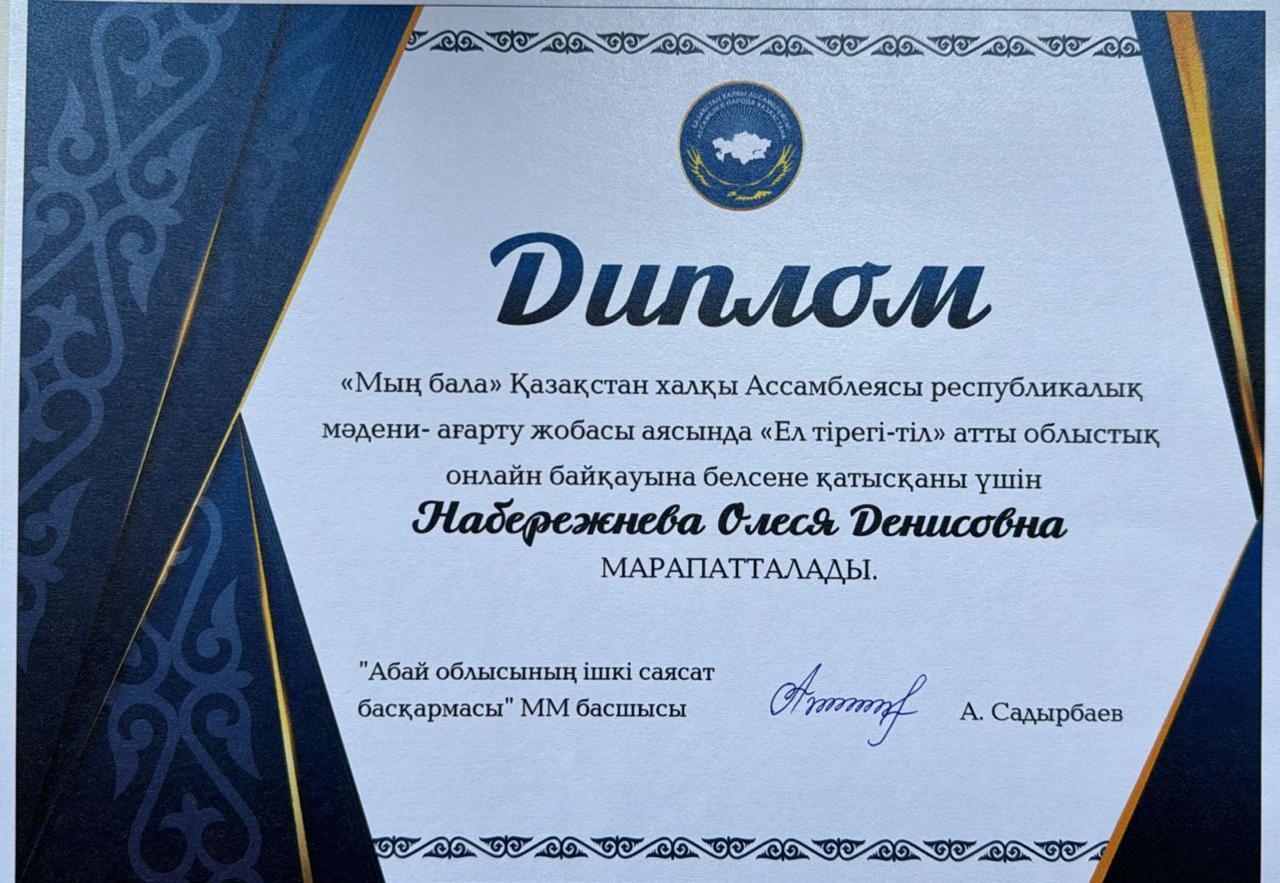Республикалық "Мың бала" Қазақстан халқы Ассамблеясы мәдени-жобасы аясында өткен "Ел тірегі - тіл" облыстық онлайн байқауына мектебіміздің 10-сынып оқушысы Набережнева Олеся қатысып, дипломмен және 30 000 теңгенің сертификатын иеленді. Сондай-ақ жетекшісі қазақ тілі мен әдебиеті пәні мұғалімі Даулетова Асия Сатбековна Алғыс хатпен марапатталды. Құттықтаймыз!