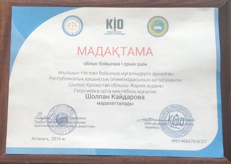 Ағылшын тілі пәні бойынша мұғалімдерге арналған Республикалық қашықтық олимпиадасының қатысушысы Шығыс Қазақстан облысы Жарма ауданы «Георгиевка орта мектебі» КММ-нің ағылшын тілі пәні мұғалімі Кайдарова Шолпан Маратовна облыс бойынша І орын алған үшін Қазақстан интернет олимпиадасының мадақтамасымен марапатталды.