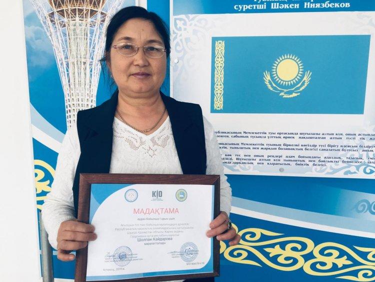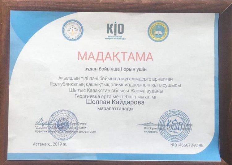 Ағылшын тілі пәні бойынша мұғалімдерге арналған Республикалық қашықтық олимпиадасының қатысушысы Шығыс Қазақстан облысы Жарма ауданы «Георгиевка орта мектебі» КММ-нің ағылшын тілі пәні мұғалімі Кайдарова Шолпан Маратовна аудан бойынша І орын алған үшін Қазақстан интернет олимпиадасының мадақтамасымен марапатталды.