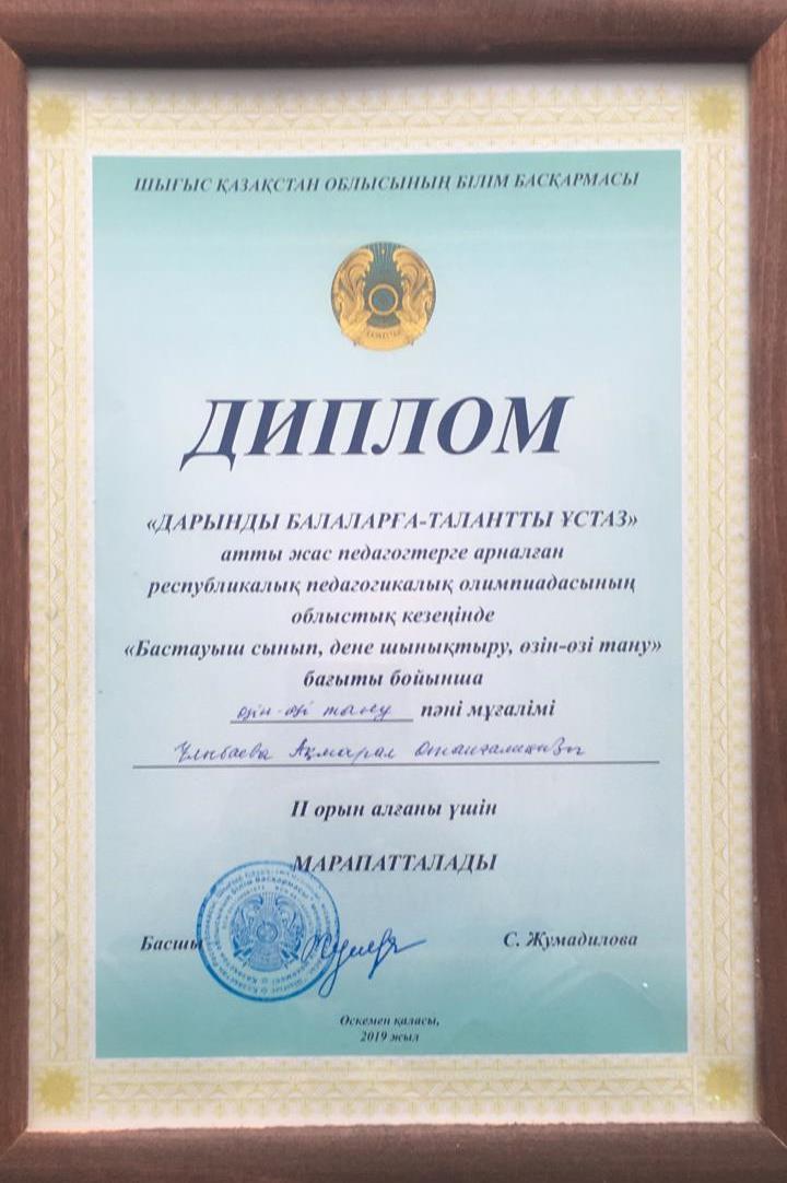 «Дарында балаларға – талантты ұстаз» атты жас педагогтерге арналған Республикалық педагогикалық олимпиадасының облыстық кезеңінде «Бастауыш сынып, дене шынықтыру, өзін – өзі тану» бағыты бойынша «Георгиевка орта мектебі» КММ – нің өзін – өзі тану пәні мұғалімі Ұлыбаева Ақмарал Отанғалиқызы ІІ орын алғаны үшін Шығыс Қазақстан облысының білім басқармасының ДИПЛОМЫМЕН марапатталып, Республикалық кезеңге жолдама алды.