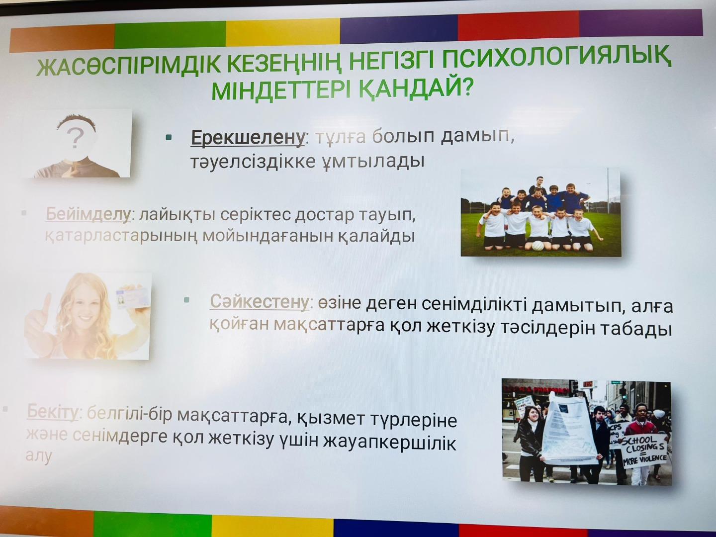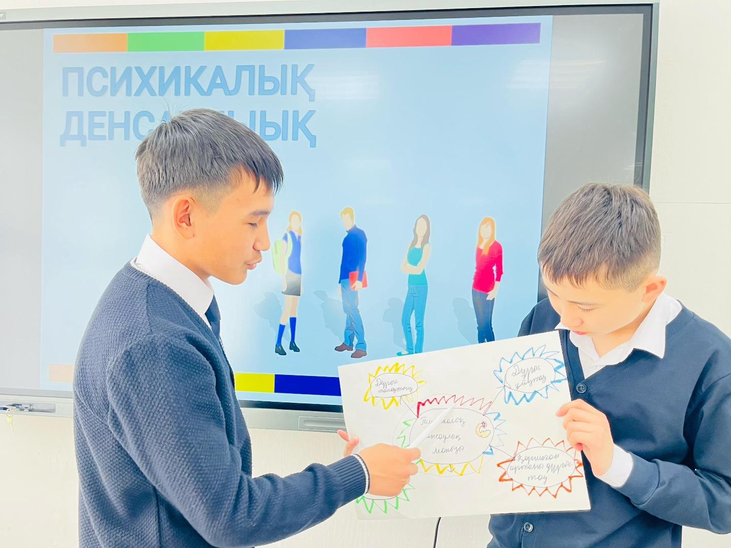 7 сәуір күні мектебімізде “Психологиялық қолдау және позитивті көңіл-күй қалыптастыру” апталығы аясында психологиялық денсаулықтың алдын алу және өз өмірінде баяндалған әдістерді қолдану мақсатында 8 “Б” сынып оқушыларымен “Психикалық денсаулықты қалай сақтау керек?” тақырыбында ақпараттар мен кеңестер берілді.