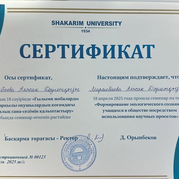 📑Семей қаласының Шәкәрім атындағы университетінің ұйымдастыруымен «Ғылыми жобаларды қолдану арқылы оқушылардың қоғамдағы экологиялық сана- сезімін қалыптастыру» тақырыбында өткен облыстық ғылыми- әдістемелік семинарға биология пәні мұғалімдері Омарова Меруерт Батырхановна мен Маралбаева Аяжан Дәулетқызы қатысып, Сертификат иеленді.