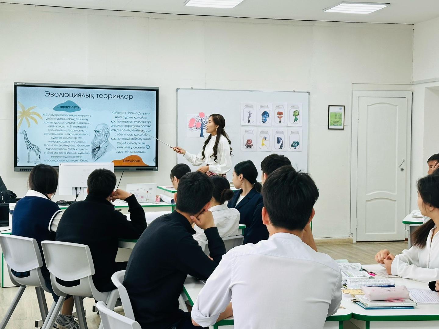 🗓️21 апреля 2025 года в соответствии с планом недели молодых специалистов «Молодой учитель – начало светлого будущего» учитель биологии Маралбаева Аяжан Дәулетқызы провела открытый урок с учащимися 9 «А» классов на тему «Основные положения эволюционной теории Ч. Дарвина».  В ходе занятия были эффективно использованы методы «Дерево желаний», платформа Kahoot, «Мыслительная головоломка». Ученики активно участвовали в уроке и получили новую информацию.
