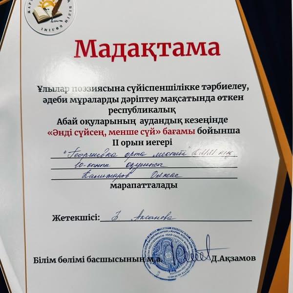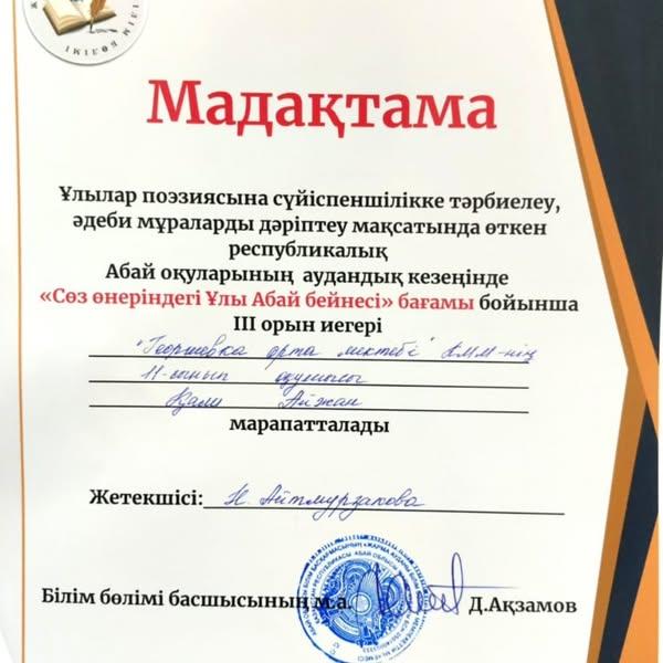 ✳️«СӨЗ ӨНЕРІНДЕГІ ҰЛЫ АБАЙДЫҢ БЕЙНЕСІ» номинациясы бойынша 11 «Б» сынып оқушысы Қали Айжан жүлделі ІІІ орын (жетекшісі қазақ тілі мен әдебиеті пәні мұғалімі Н.Д.Айтмурзакова) иегерлері атанды. Құттықтаймыз!!!