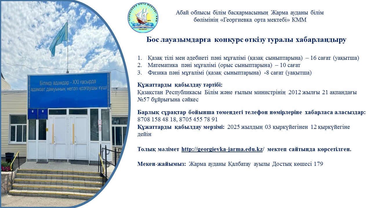 Бос лауазымға конкурс өткізу туралы хабарландыру » «Георгиевка орта мектебі» КММ