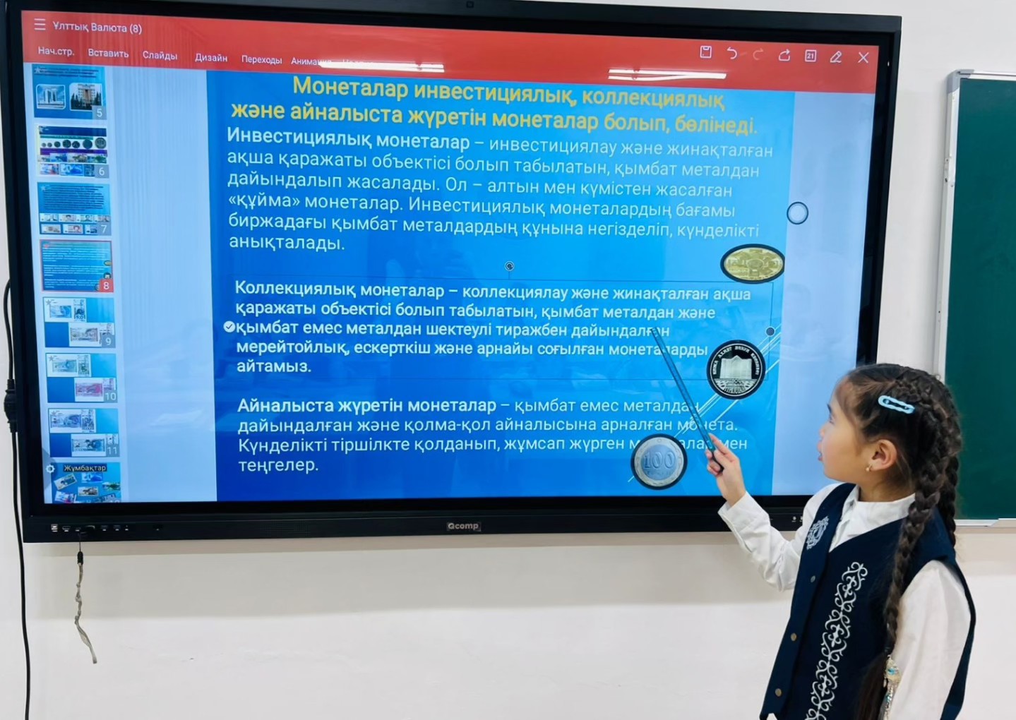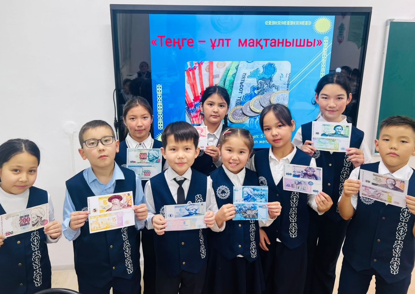 Сабақ барысында оқушылар қызықты деректермен танысып, викториналарға қатысып, өз ойларымен бөлісті. Теңге – еліміздің экономикалық егемендігінің символы екенін тағы да бір сезіндік.