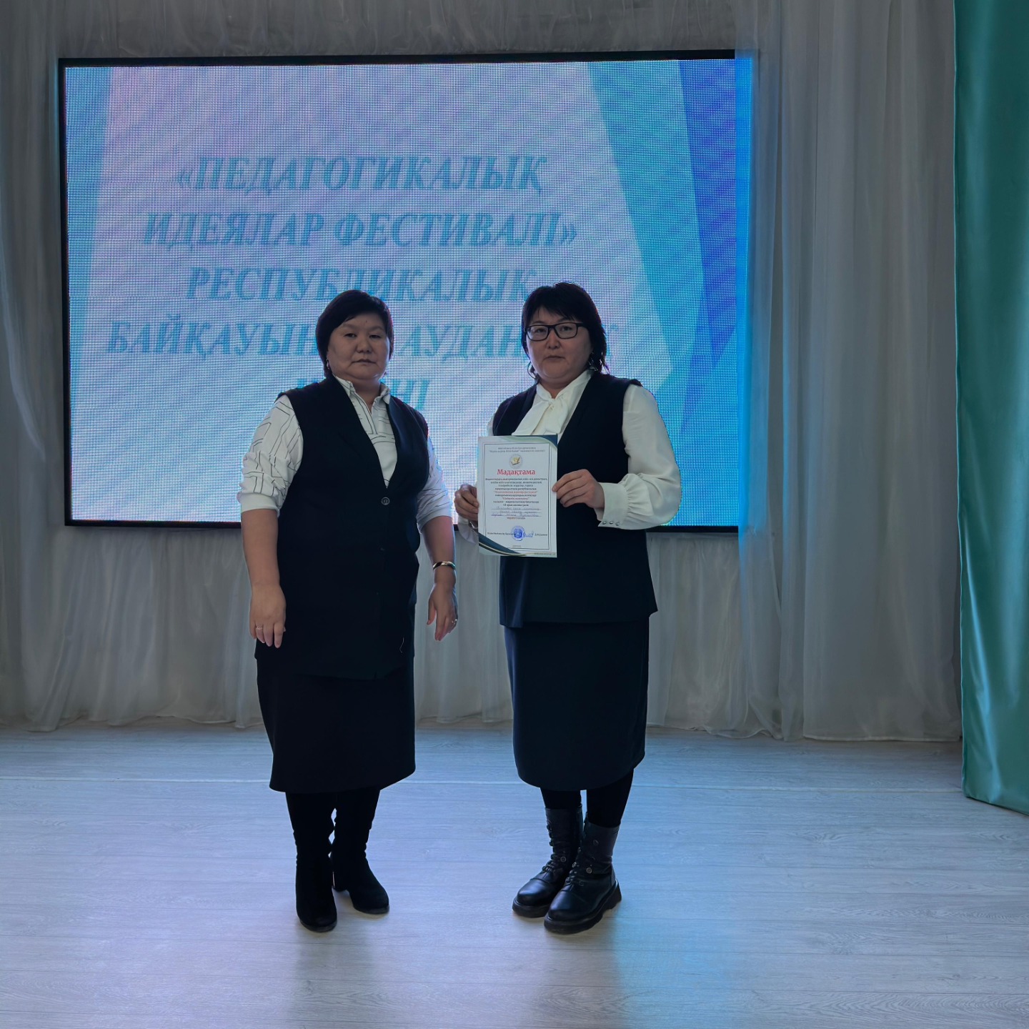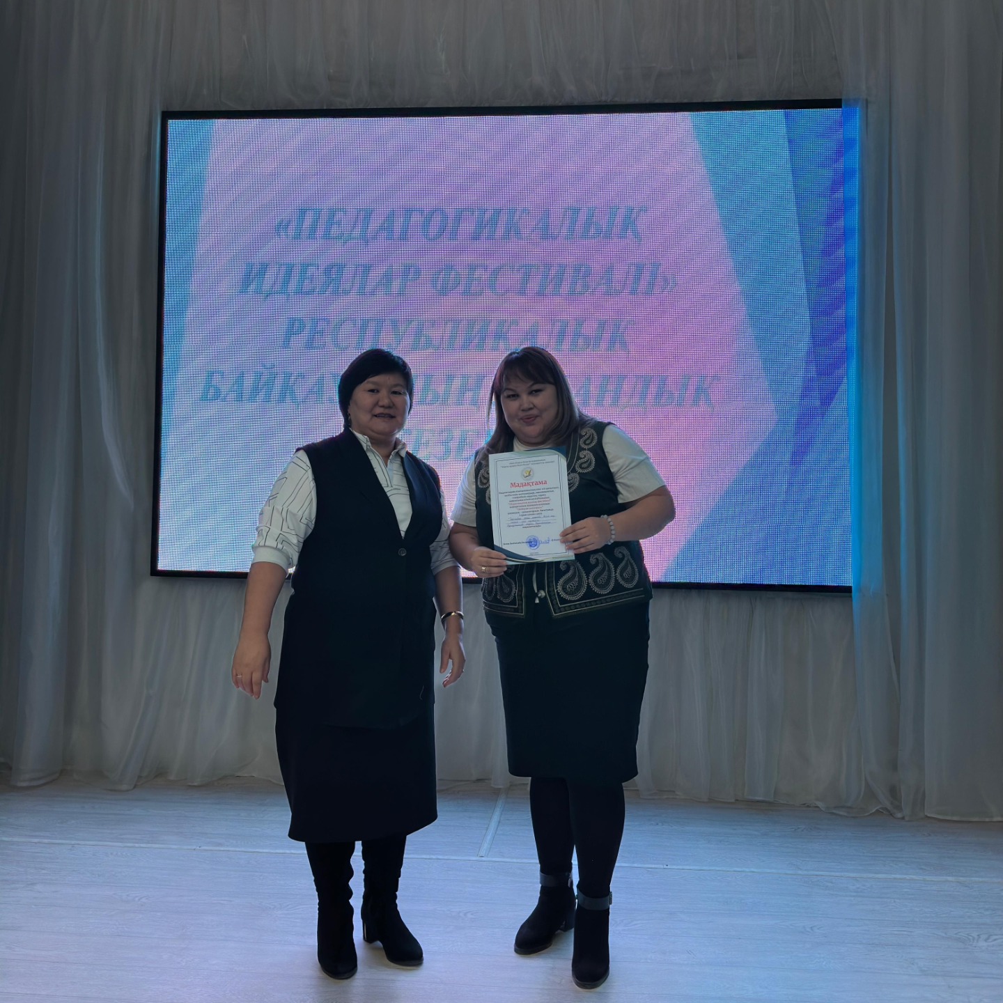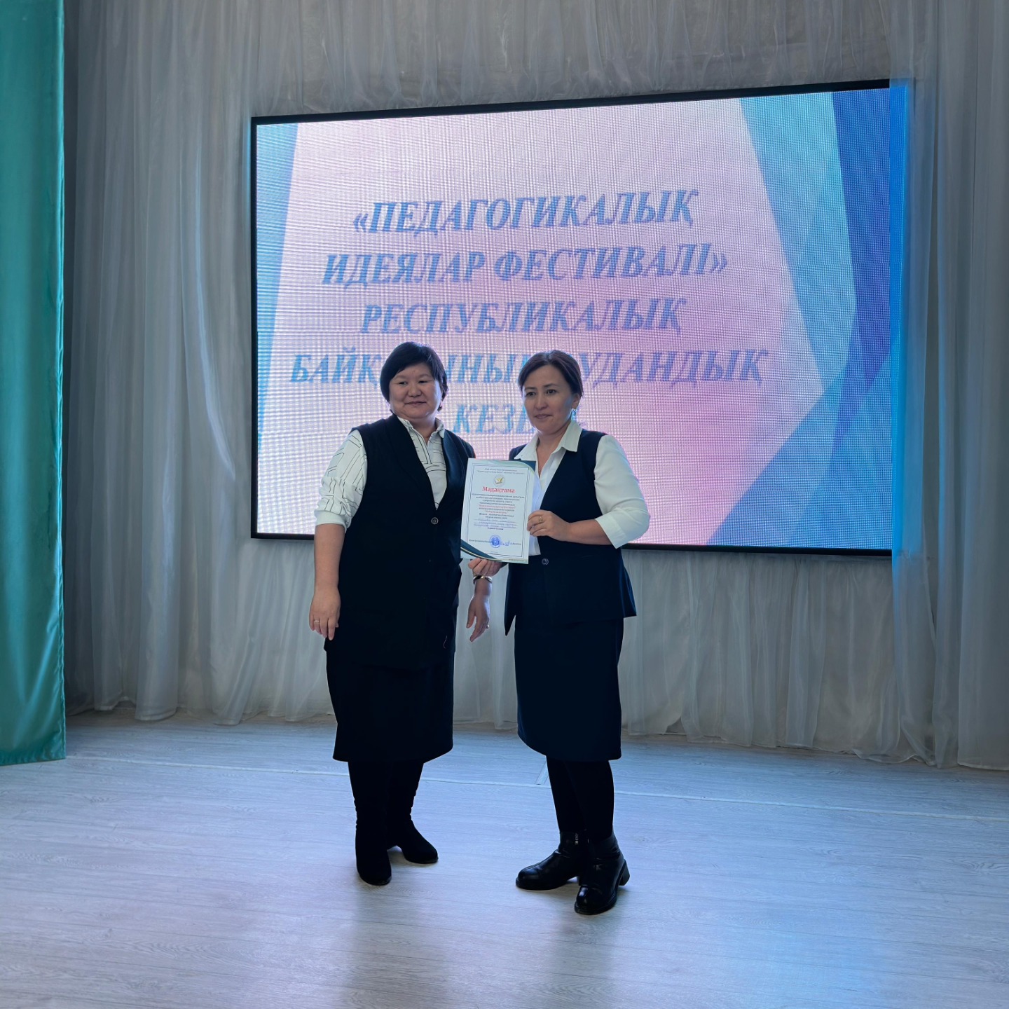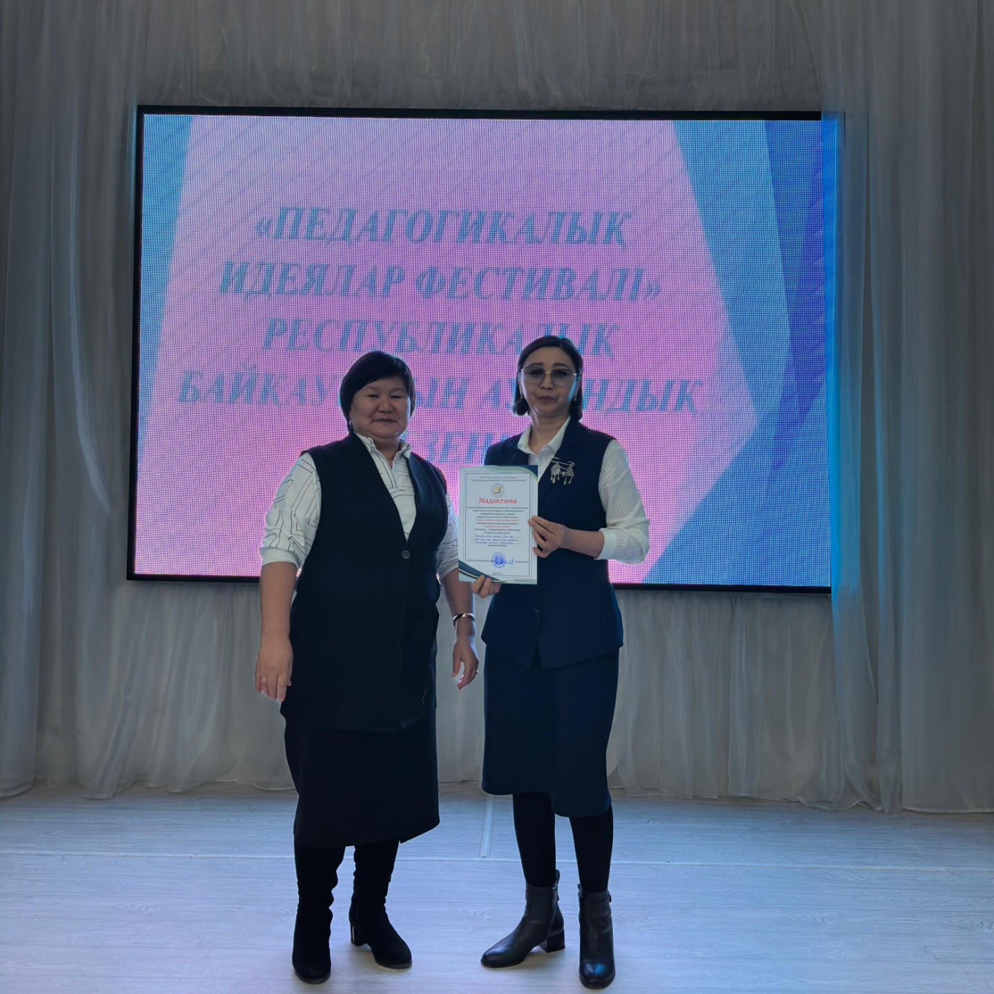 "Шеберлік палитрасы" қоғамдық-гуманитарлық бағыттағы пәндер бойынша орыс тілі мен әдебиеті пәні мұғалімі БАЯНДИНОВА ГУЛЬЖАН ТУРГАЗИНОВНА ІІІ орын;