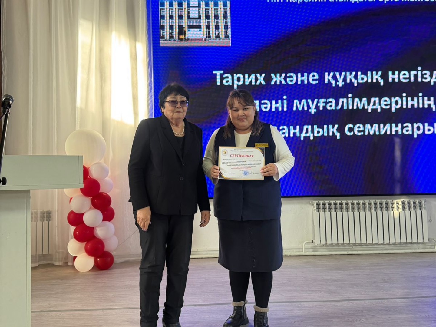 2025 жылдың 26 қараша күні тарих және құқық негіздері пәні мұғалімдеріне арналған «Тарих және құқық негіздері: оқытудағы жаңа технологиялар» тақырыбында аудандық семинар өтті. Семинарға мектебіміздің тарих пәні мұғалімі Нурмухаметова Айдана Дәулетбекқызы «Қазақстан тарихы және құқық негіздері пәні мұғалімдерінің кәсіби өсуіне әсер ететін факторлар» тақырыбында шеберлік сынып өткізіп, Сертификат иеленді.