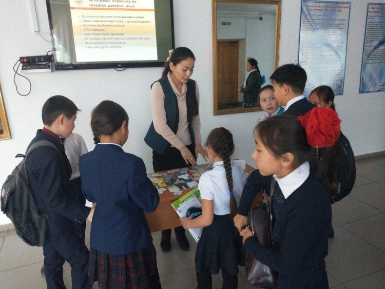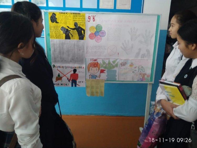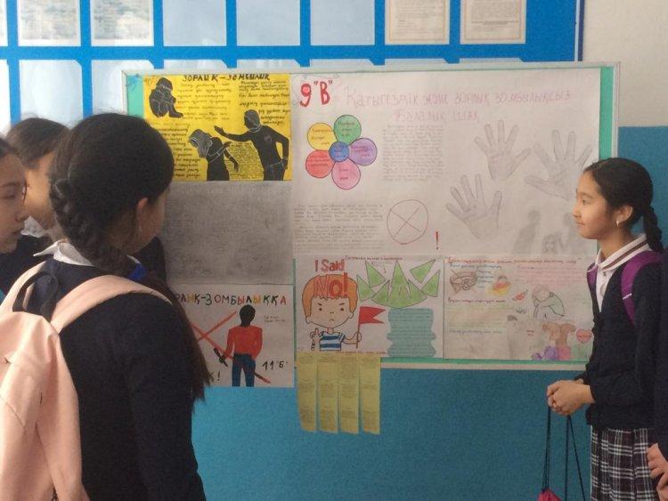 2019 жылдың 11-15 қараша аралығында «Қатыгездік және зорлық-зомбылықсыз балалық шақ» атты республикалық ақпарат науқаны жоспарына сәйкес 9-11-сыныптар арасында сынып жетекшілер, мектеп тәлімгері және «Прожектор» орталығының жетекшісінің ұйымдастыруымен аталған тақырыпта газет шығарылды. Мектеп психологі А.Н.Кокиева өмірлік қиын жағдайларға түскен балалар мен отбасыларға «Қызу желі», жасөспірімдер мен жастар үшін «Сенім телефонының» қызметін жандандыру жұмыстары бойынша қоғамның назарын балаларға қатысты зорлық-зомбылық мәселелеріне аудару, қоғамда балаларды қатыгез ұстауға төзбеушілік қарым-қатынас қалыптастыру мақсатында акция ұйымдастырды.