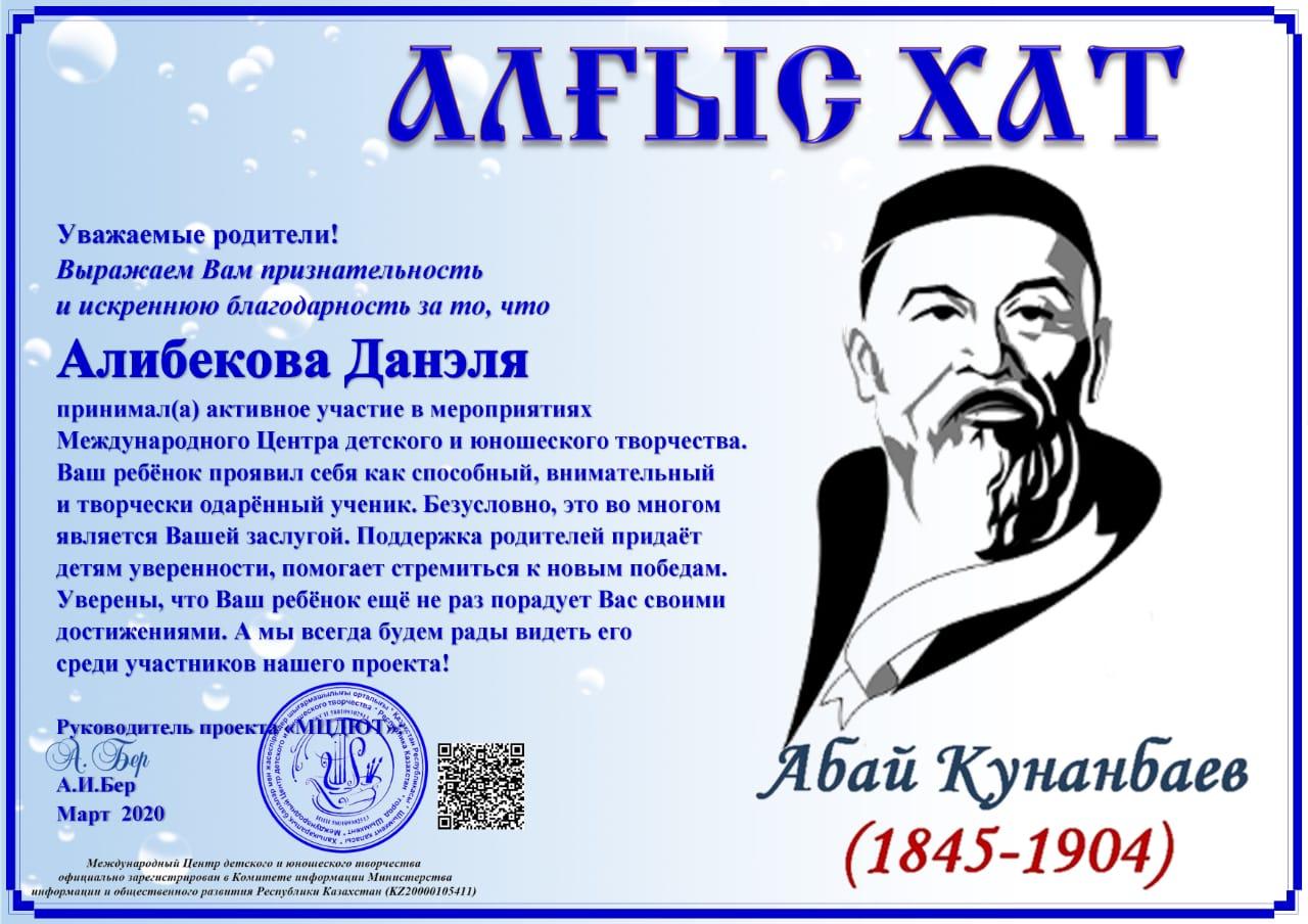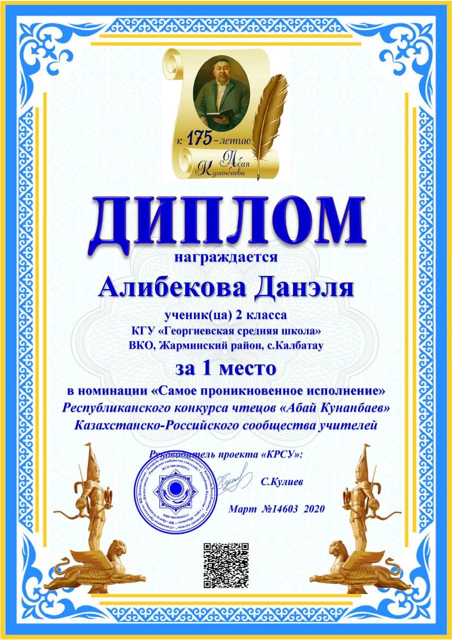 Қазақстандық-Ресейлік мұғалімдер қауымдастығы  ұйымдастырған республикалық «Абай Құнанбаев» мәнерлеп оқу  сайысының «Самое проникновенное  исполнение»  номинациясы бойынша  «Георгиевка    орта  мектебі» КММ-нің  2-сынып оқушысы  Алибекова Данэля  жүлделі І орын иегері атанды.  Жетекшісі   Жанузакова Г.А.