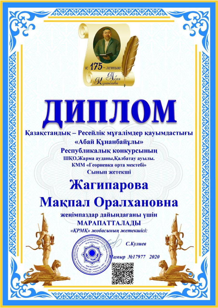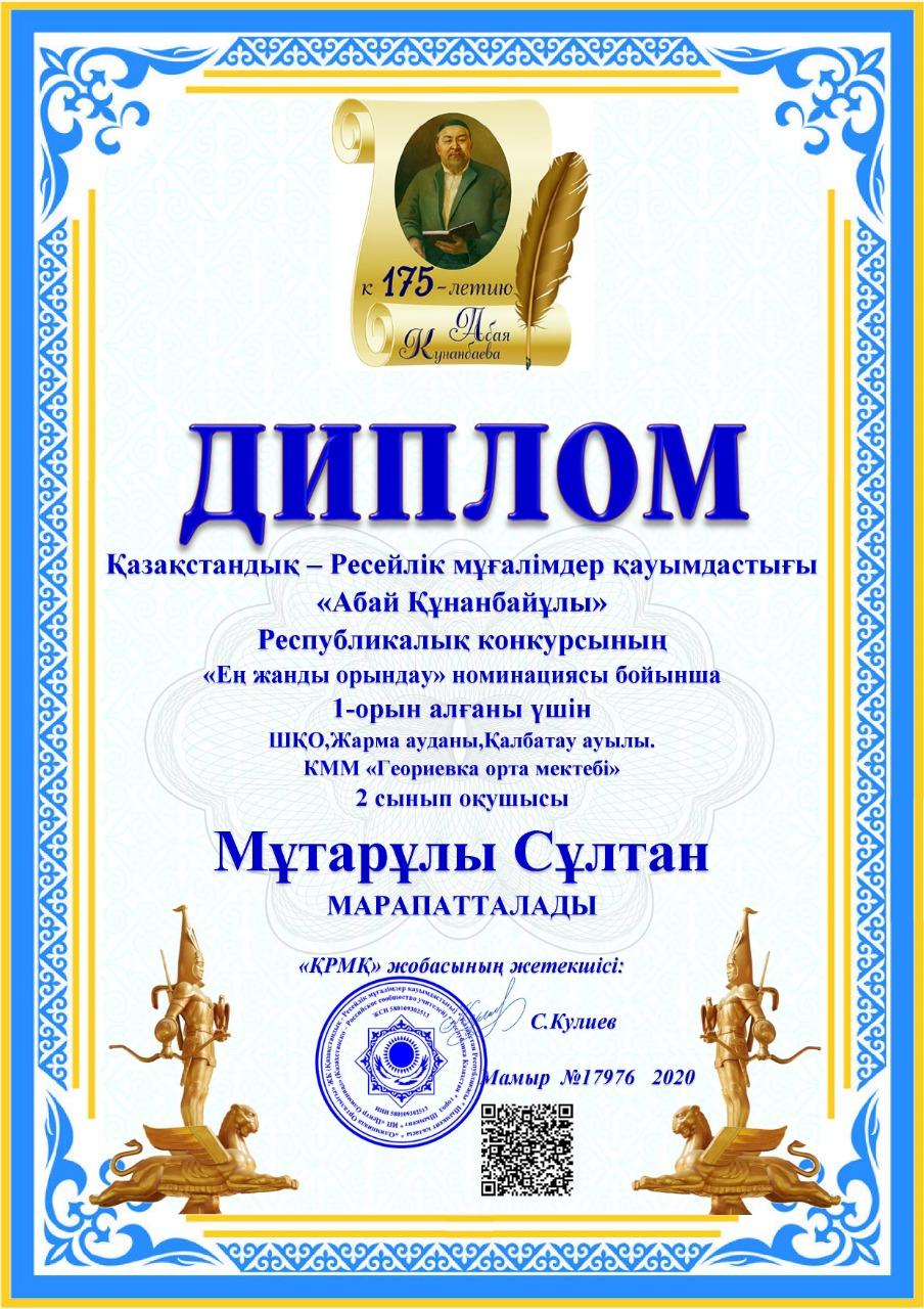 Қазақстандық-Ресейлік мұғалімдер қауымдастығы  ұйымдастырған «Абай Құнанбайұлы» Республикалық конкурсының  «Ең жанды орындау»  номинациясы бойынша  «Георгиевка    орта  мектебі» КММ-нің  2-сынып оқушысы  Мұхтарұлы Сұлтан Бейбарыс  жүлделі І орын иегері атанды.  Жетекшісі   М.О. Жагипарова  жеңімпаз дайындағаны үшін дипломмен марапатталды.