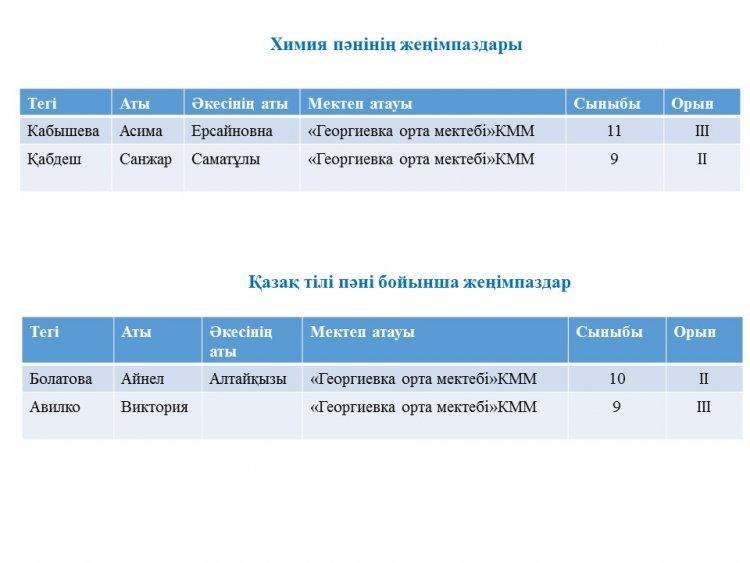 Олимпиадаға «Георгиевка орта мектебі» КММ-нің оқушылары қатысып, нәтижесінде химия пәні бойынша 11 –сынып оқушысы Кабышева Асима ІІІ орын, 9-сынып оқушысы Қабдеш Санжар ІІ орын иеленсе, қазақ тілі пәні бойынша 10-сынып оқушысы Болатова Айнел ІІ орын, 9- сынып оқушысы Авилко Виктория ІІІ орынды иеленді.