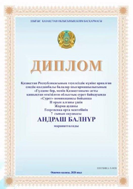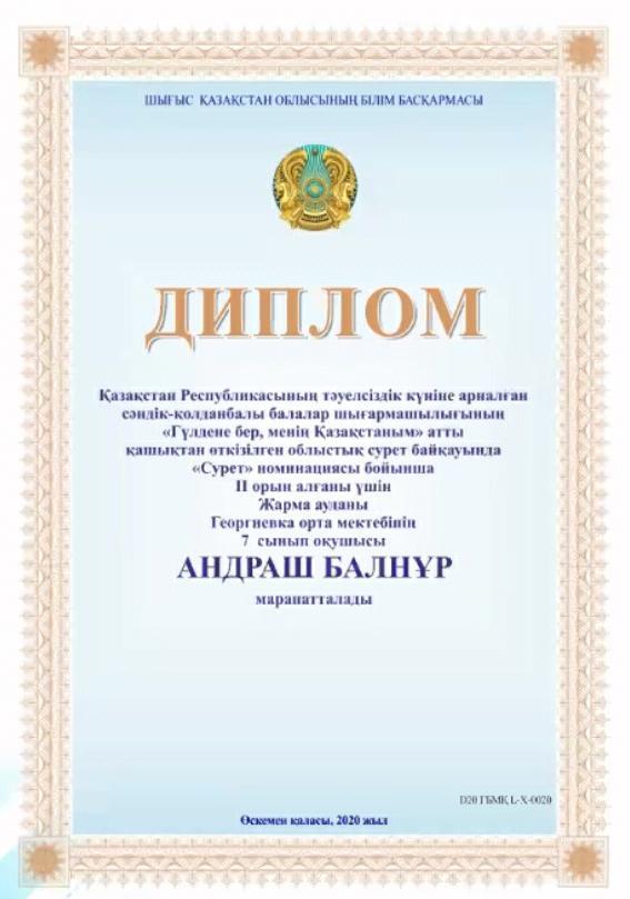 Қазақстан Республикасының Тәуелсіздігін мерекелеу қарсаңында балалар мен жасөспірімдердің шығармашылық қызметке деген ынтасын арттыру, дарынды балаларды анықтау және қолдау, олардың шығармашылық өзін –өзі жүзеге асыруына жағдай жасау арқылы балалардың бойында патриоттық сезімді қалыптастыру мақсатымен «Гүлдене бер, менің Қазақстаным» көркем өнер облыстық сурет байқауы өтті. Байқаудың облыстық кезеңіне «Сурет» номинациясы бойынша «Георгиевка орта мектебі» КММ-нің 7-сынып оқушысы Андраш Балнұр қатысып, жүлделі ІІ орынды иеленді. Жетекшісі Беккасимова Л.Т. Жеңімпаз иесін және жетекшісін құттықтаймыз!!!
