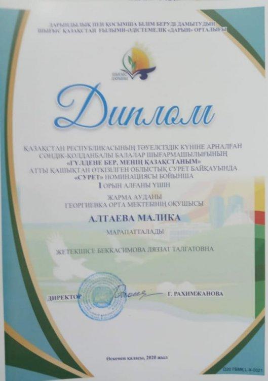 Тәуелсіздік күні мерекесіне орай, балалар мен жасөспірімдердің шығармашылық қызметке деген ынтасын арттыру, дарынды балаларды анықтау және қолдау мақсатымен ұйымдастырылған «Гүлдене бер, менің Қазақстаным» көркем өнер облыстық сурет байқауының облыстық кезеңіне "Сурет" номинациясы бойынша «Георгиевка орта мектебі» КММ-нің 3-сынып оқушысы Алтаева Малика қатысып, жүлделі І орынды иеленді. Жетекшісі Беккасимова Л.Т. Жеңімпаз иесін және жетекшісін құттықтаймыз!!!