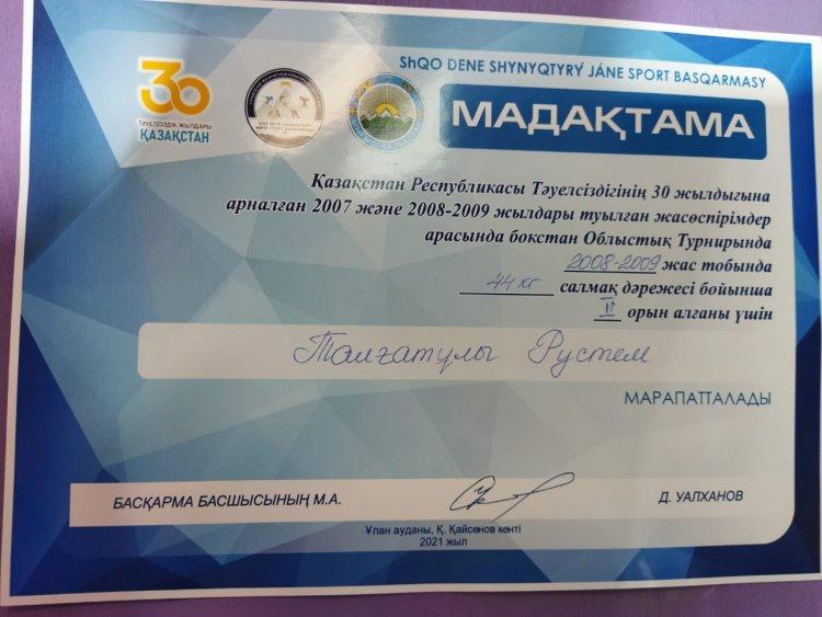 Қазақстан Республикасы  Тәуелсіздігінің 30 жылдығына арналған 2007-2009 жылдары туылған жасөспірімдер арасында бокстан ОБЛЫСТЫҚ ТУРНИРДЕ мектебіміздің 6-сынып оқушысы  ТАЛҒАТҰЛЫ РУСТАМ жүлделі ІІ орынға ие болды. Жетекшісі  Б.Ж.Кошкинбаев.