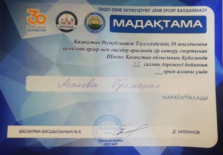 2021 жылдың  19 сәуір  күні  Шығыс Қазақстан облысының Кубогында  гір көтеру  спорты  бойынша  «Георгиевка орта  мектебі» КММ-нің командасы қатысып,    Ұлыбаева А.О. ІІІ  орынды,   Асанова Г.А.  І орынды  жеңіп  алды.  Жетекшісі  Рахимгалиев Д.М.  Жеңімпаз  иелерін  және  жетекшісін құттықтаймыз.
