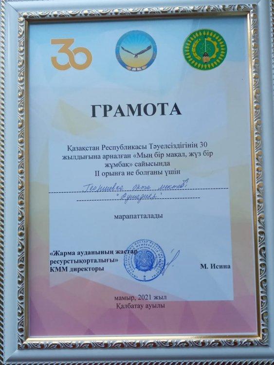 2021 жылдың 20 мамыр күні Қазақстан Республикасы Тәуелсіздігінің 30 жылдығына орай «Жарма аудандық Жастар ресурстық орталығы» КММ-нің ұйымдастыруымен өткен «Мың бір мақал, жүз бір жұмбақ» сайысына «Георгиевка орта мектебі»КММ-нің «Аушадияр» тобы қатысып, жүлделі ІІ орынды иеленді. Жетекшісі Қадылбеков Д.Е. Жеңімпаз иелерін және жетекшісін құттықтаймыз!