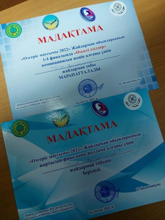 02 март 2022 0 1 2 3 4 5 "Өзгеріс маусымы-2022" жайдарман ойындары "Георгиевка орта мектебі"КММ-нің командасы "Өзгеріс маусымы-2022" жайдарман ойындарының "Өзекті әзілдер" номинациясы мен жүлделі І орынды жеңіп алып, жартылай финалға жолдама алды. Жетекшілері Қадылбеков Д.Е., Ұлыбаева А.О.