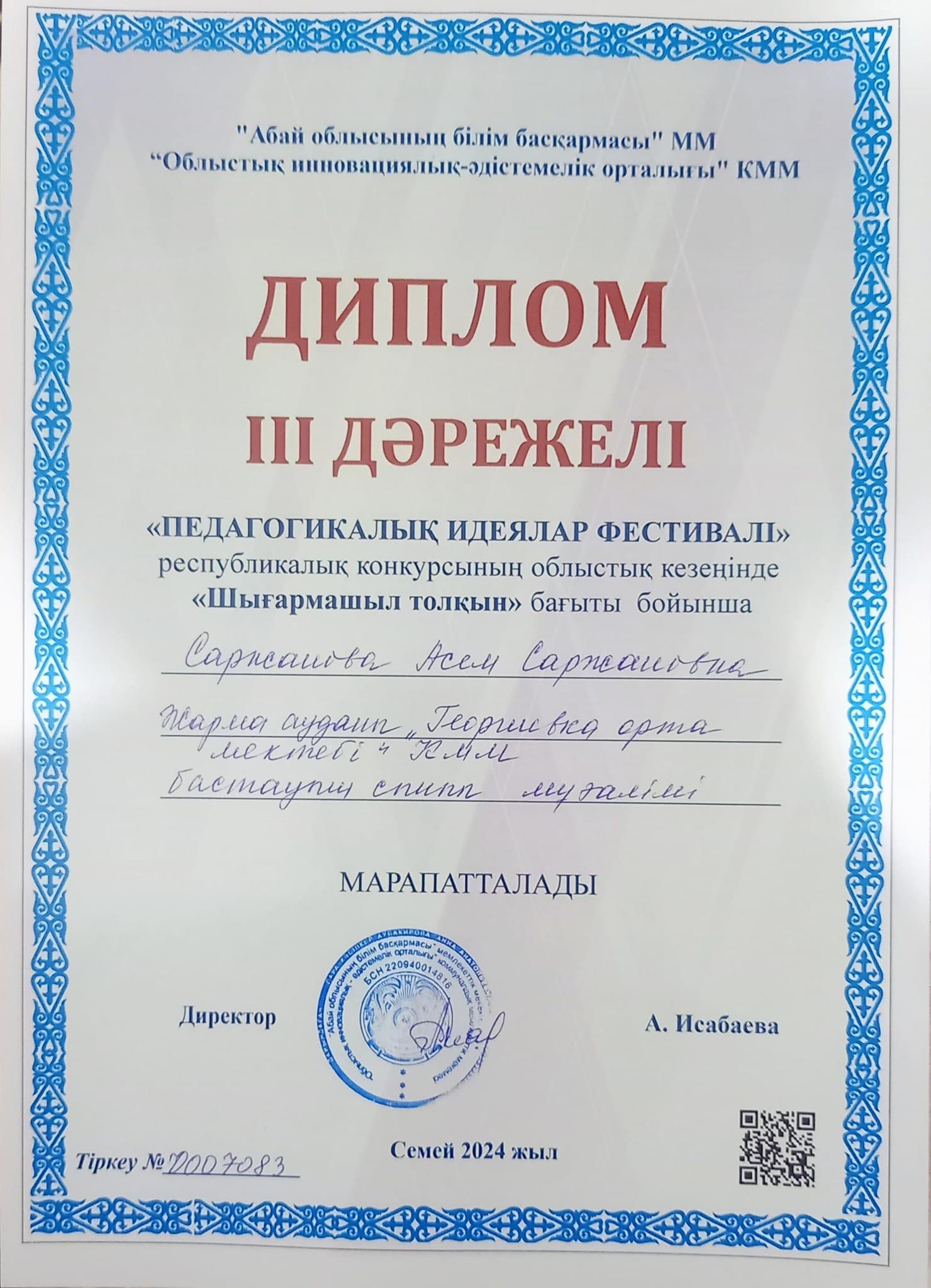 2024 жылы 06 желтоқсан күні "Педагогикалық идеялар фестивалі" республикалық конкурсының облыстық кезеңі өтті. Конкурс нәтижесі бойынша "Шығармашыл толқын" бағыты бойынша мектебіміздің бастауыш сынып мұғалімі Саржанова Асем Саржановна жүлделі ІІІ орын иегері атанды.Әріптесімізді шын жүректен құттықтап, шығармашылық табыс тілейміз!
