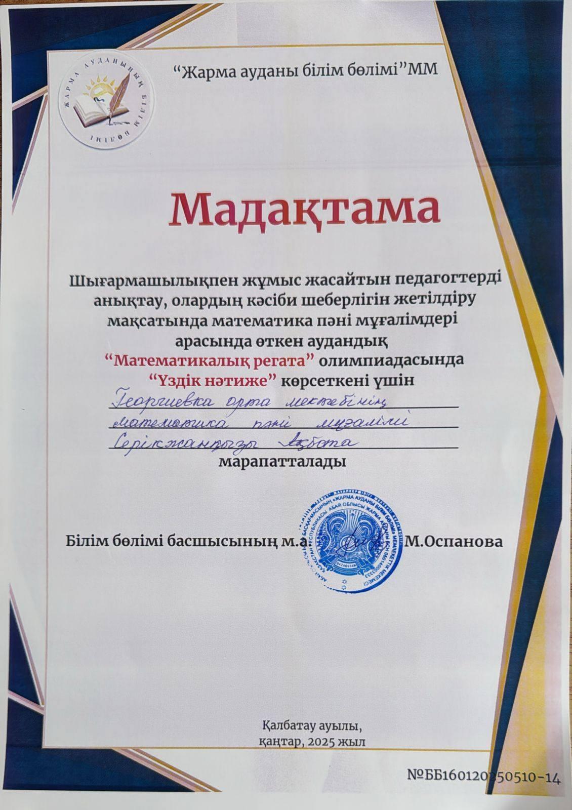 2025 жылдың 16 қаңтар күні математика пәні мұғалімдеріне арналған «Математикалық регата» республикалық олимпиаданың аудандық кезеңі өтті. Олимпиадаға қатысқан математика пәні мұғалімі Серікжанқызы Ақбота "Үздік нәтиже" көрсеткені үшін мадақтамамен марапатталды.