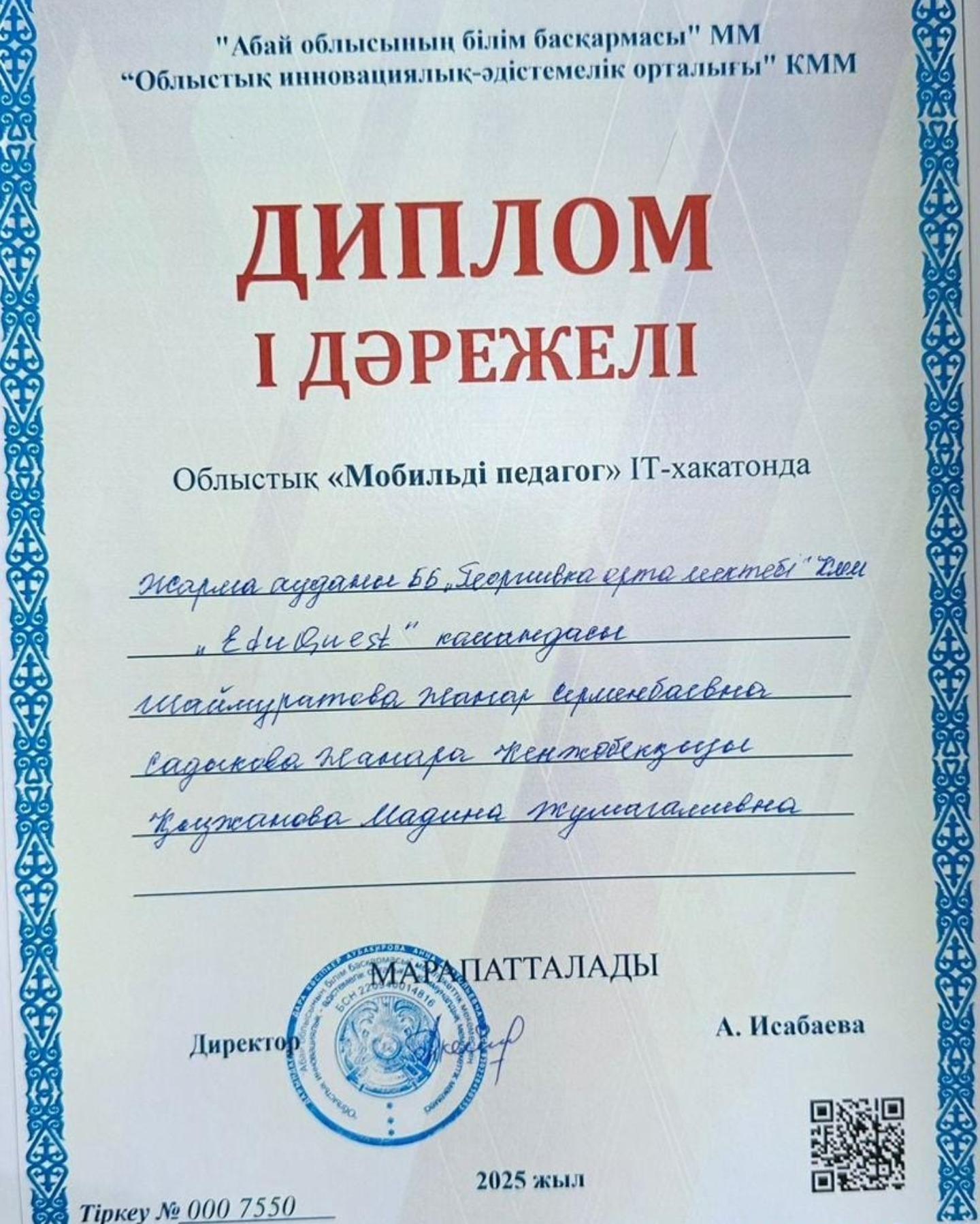 2025 жылдың 05 ақпан күні облыстық "Мобильді педагог" ІТ-хакатонында мектебіміздің "EduQwest" командасы «Ерекше білімді қажет ететін балаларды оқытуда цифрлық технологияларды қолдану» тақырыбында өз жобаларын қорғап, жүлделі І ДӘРЕЖЕЛІ ДИПЛОМ иегерлері атанды. Команда құрамы:
