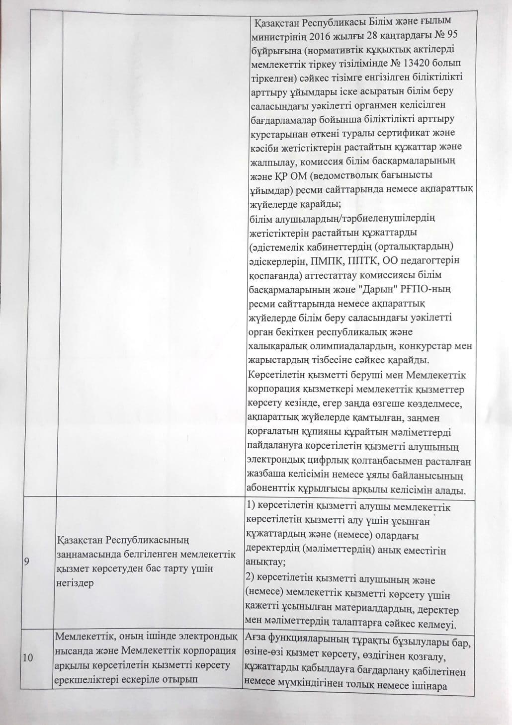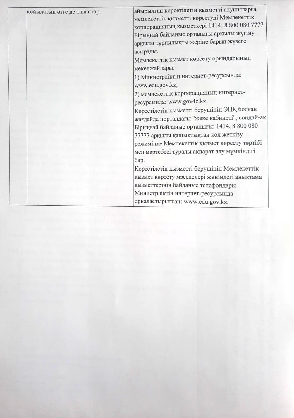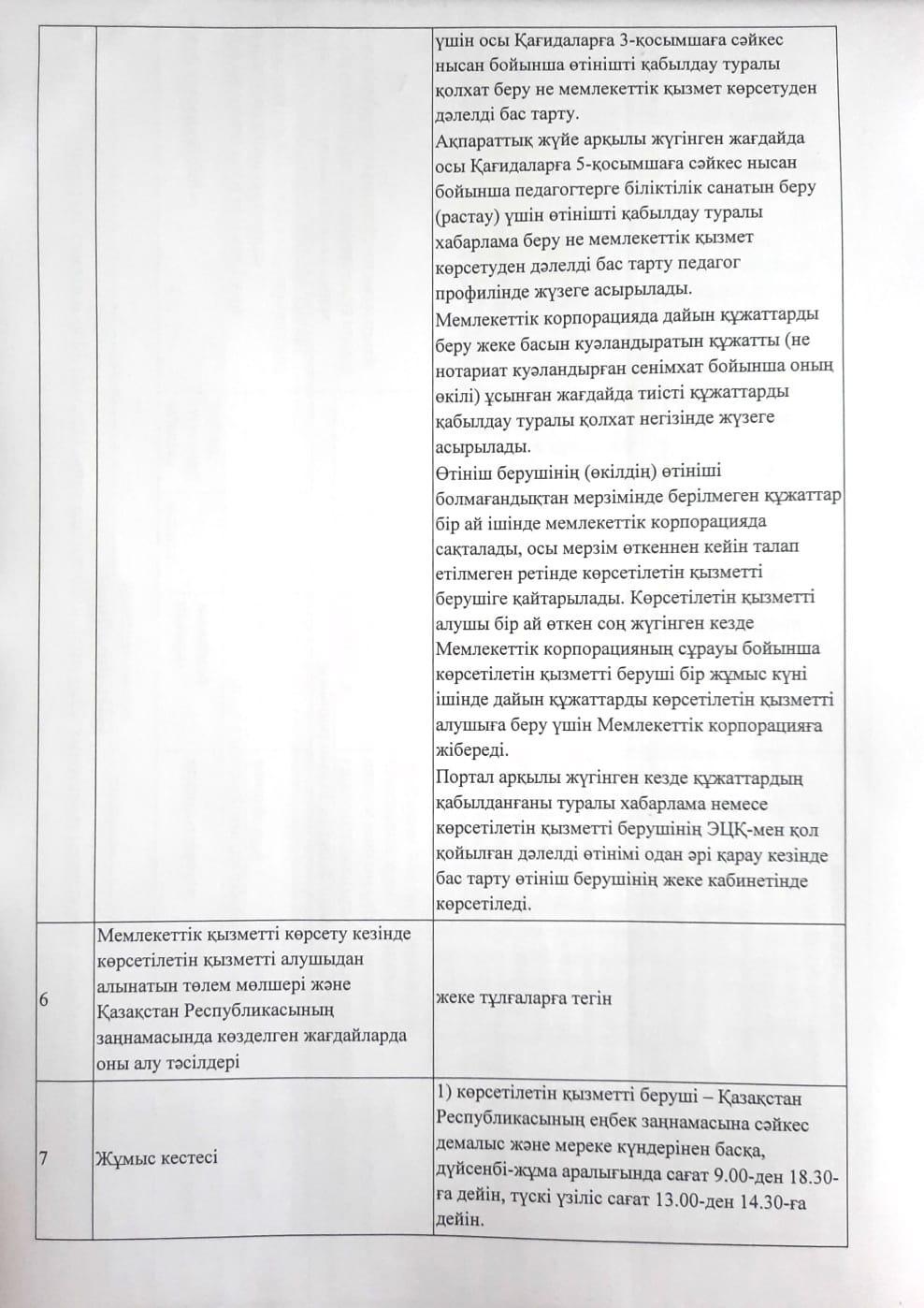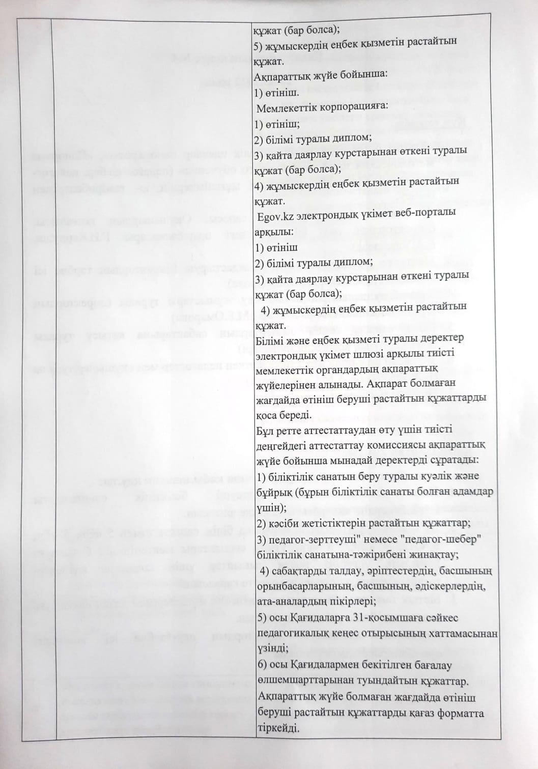 01 март 2023 0 1 2 3 4 5 "Педагогтерді аттестациядан өткізу үшін құжаттарды қабылдау" мемлекеттік қызмет көрсетуге қойылатын негізгі талаптар тізбесі