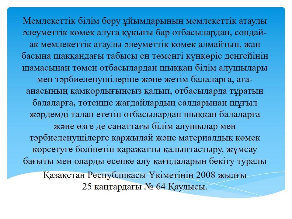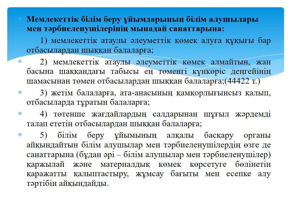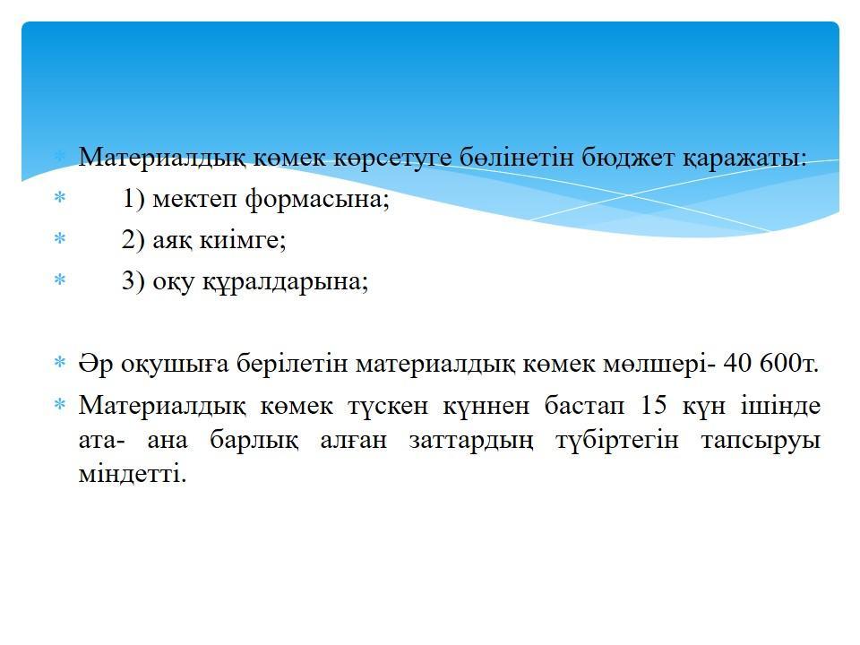 05 июнь 2023 0 1 2 3 4 5 Әртүрлі санаттағы білім алушыларға қаржылай және материалдық көмек көрсету туралы