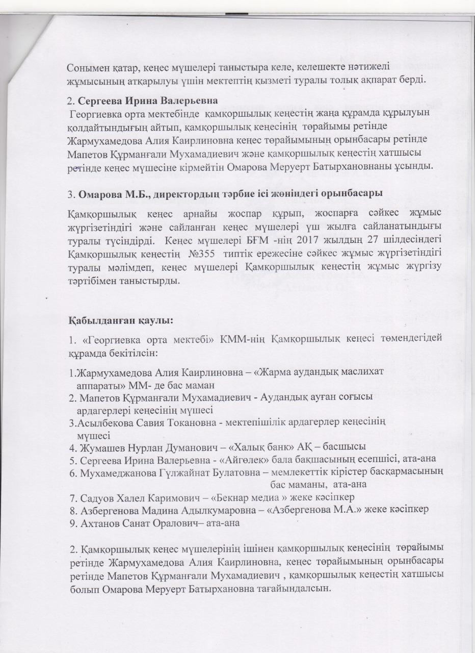 Қамқоршылық кеңесі жиналысының №1 хаттамасы » «Георгиевка орта мектебі» КММ