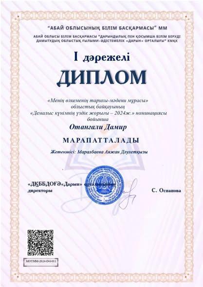 «Менің өлкемнің тарихи – мәдени мұрасы» атты Жошы ұлысының 800 жылдығына және Абай облысының өлкетану жасақтарының құрылғанына бір жылдығына арналған ОБЛЫСТЫҚ байқауының "Демалыс күнімнің үздік жорығы-2024" номинациясы бойынша мектебіміздің 10-сынып оқушысы Отанғали Дамир жүлделі І дәрежелі диплом иегері атанды. Жетекшісі Маралбаева Аяжан Дәулетқызы. Құттықтаймыз!!!