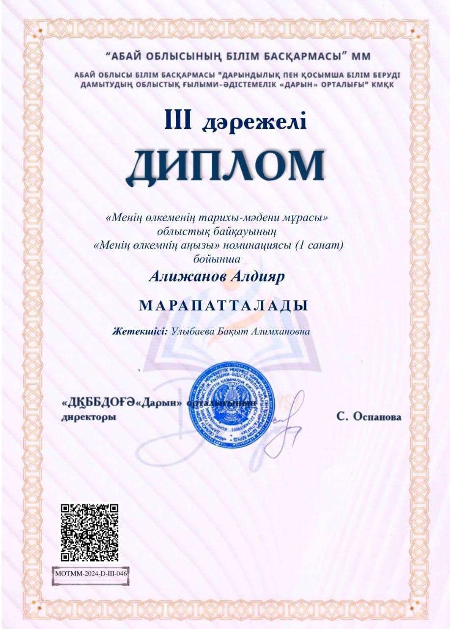 "Менің өлкемнің тарихы-мәдени мұрасы" облыстық байқауында "Менің өлкемнің аңызы" номинациясы бойынша мектебіміздің оқушылары ІІІ дәрежелі диплом иегерлері атанды.1. Алижанов Алдияр, жетекшісі Б.А.Улыбаева;