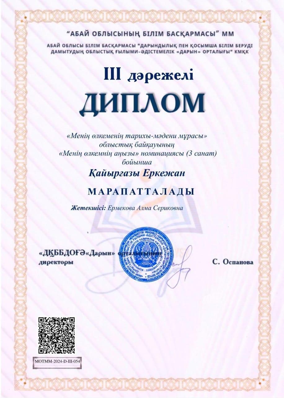 "Менің өлкемнің тарихы-мәдени мұрасы" облыстық байқауында "Менің өлкемнің аңызы" номинациясы бойынша мектебіміздің оқушылары ІІІ дәрежелі диплом иегерлері атанды.