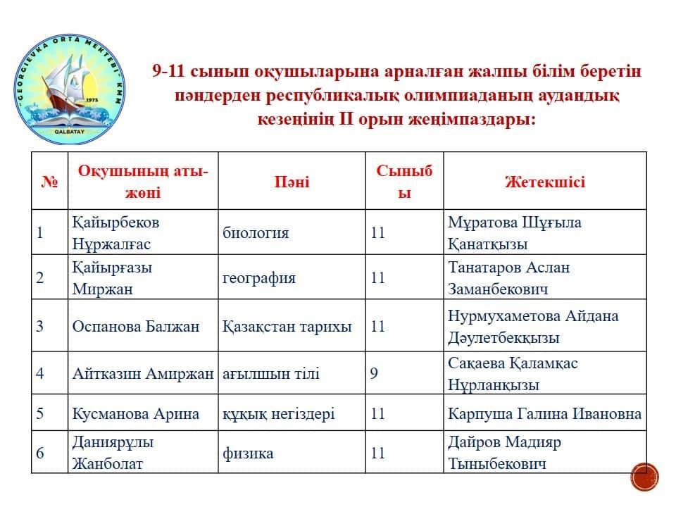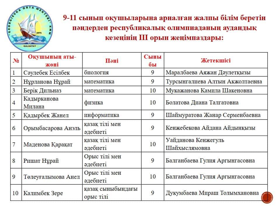 06 декабрь 2024 0 1 2 3 4 5 9-11 сынып оқушыларына арналған жалпы білім беретін пәндерден республикалық олимпиаданың аудандық кезең қорытындысы 9-11 сынып оқушыларына арналған жалпы білім беретін пәндерден республикалық олимпиаданың аудандық кезең қорытындысы