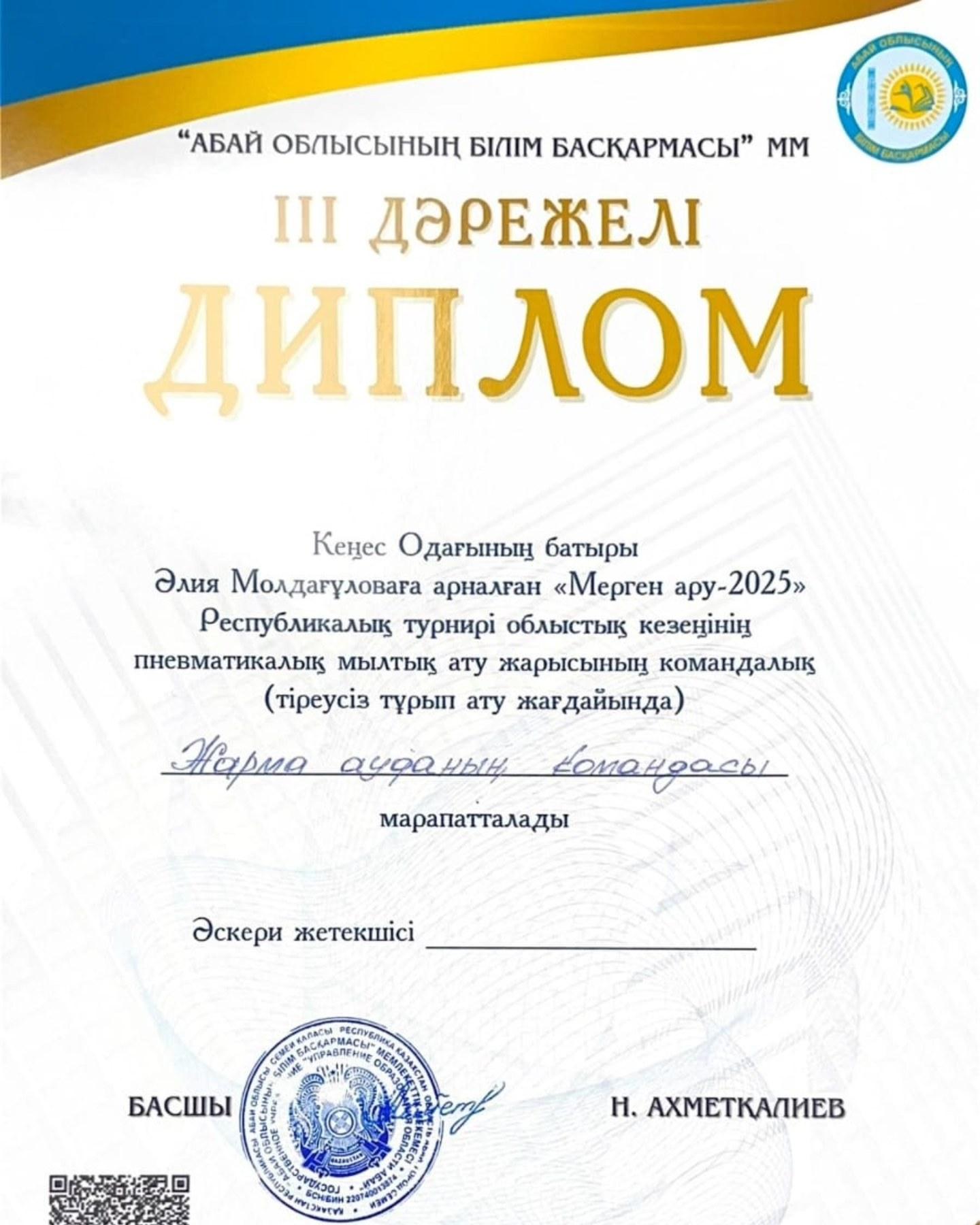 На областном этапе республиканского турнира "Мерген ару-2025", посвященного Герою Советского Союза Алии Молдагуловой, команда Жарминского района заняла 3 место. В составе команды выступила ученица 10 класса Жексенбинова Жанна.