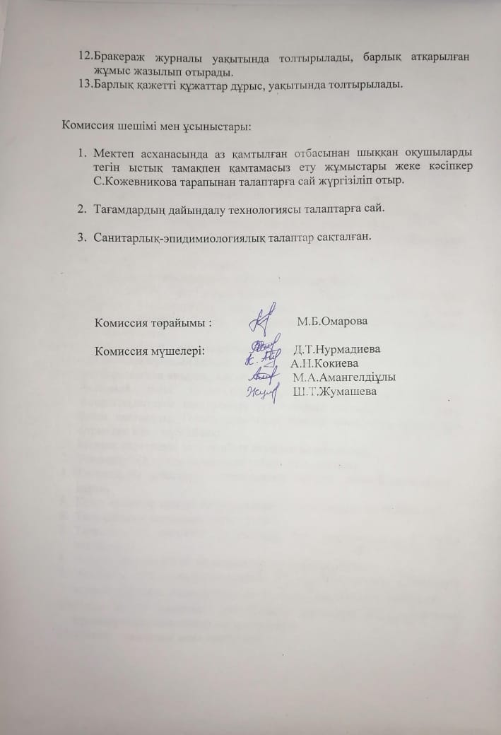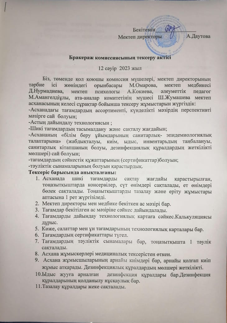 Бракераж комиссиясының тексеру актісі » «Георгиевка орта мектебі» КММ