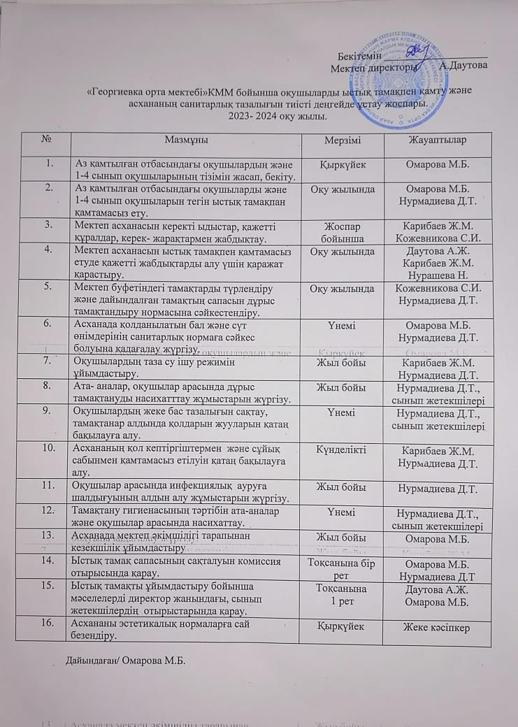 Ыстық тамақпен қамту және асхананың санитарлық тазалығын тиісті деңгейде ұстау жоспары. » «Георгиевка орта мектебі» КММ