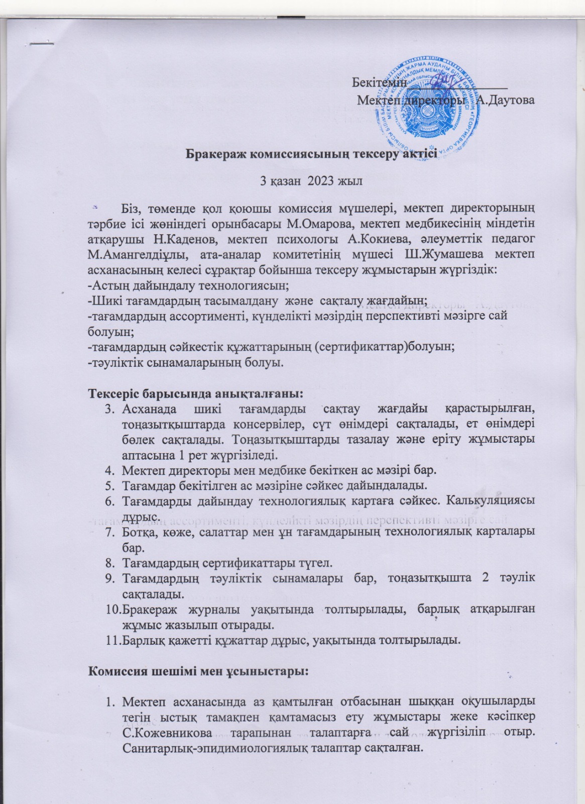 Бракераж комиссиясының тексеру актісі » «Георгиевка орта мектебі» КММ