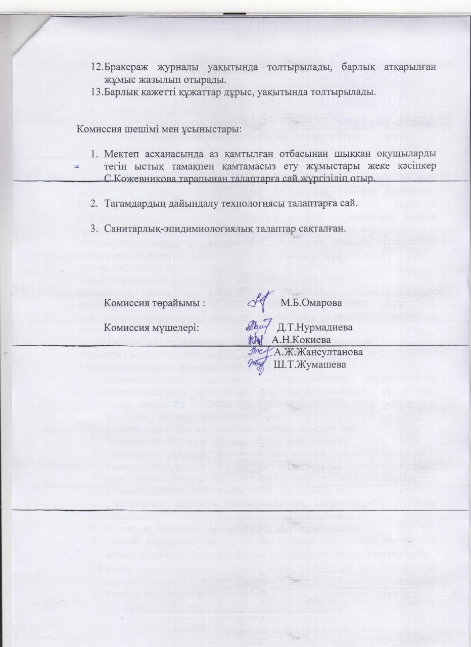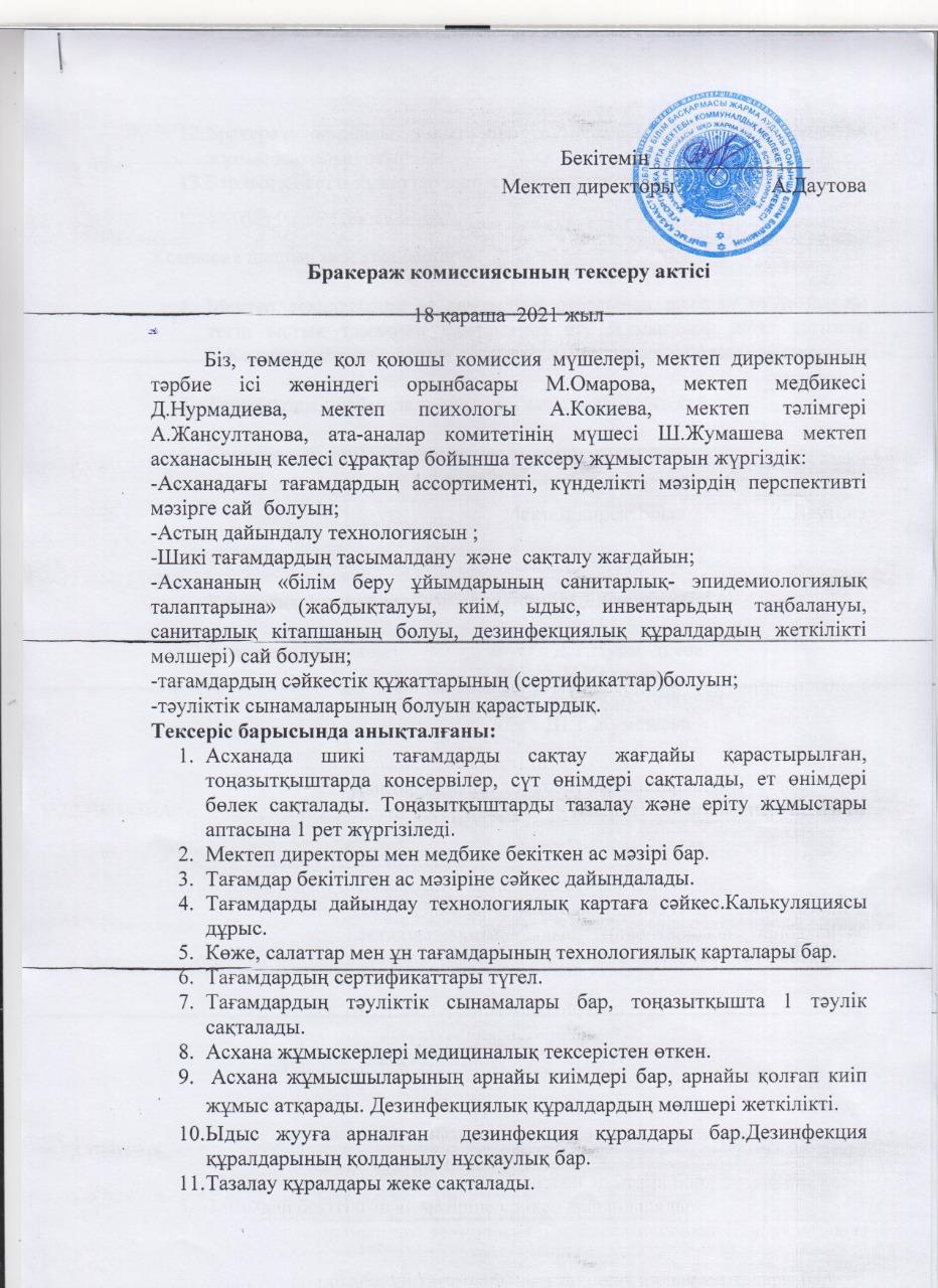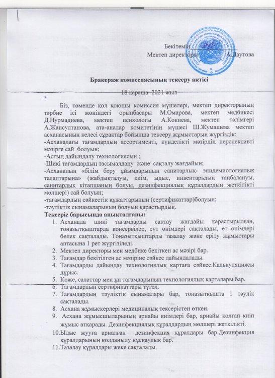 Бракераж комиссиясының тексеру актісі » «Георгиевка орта мектебі» КММ