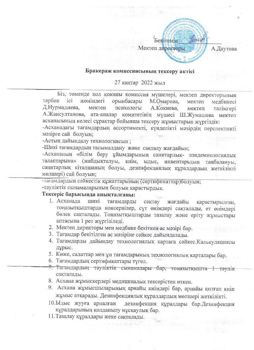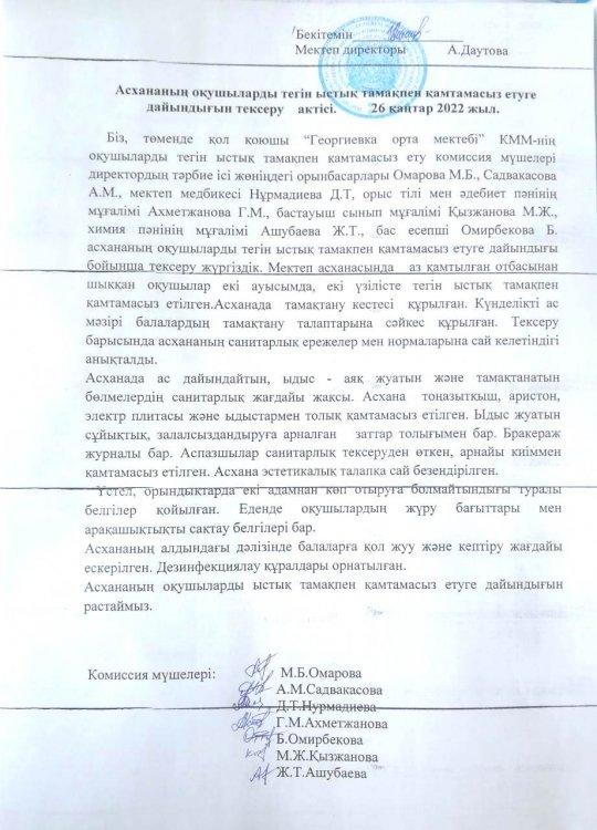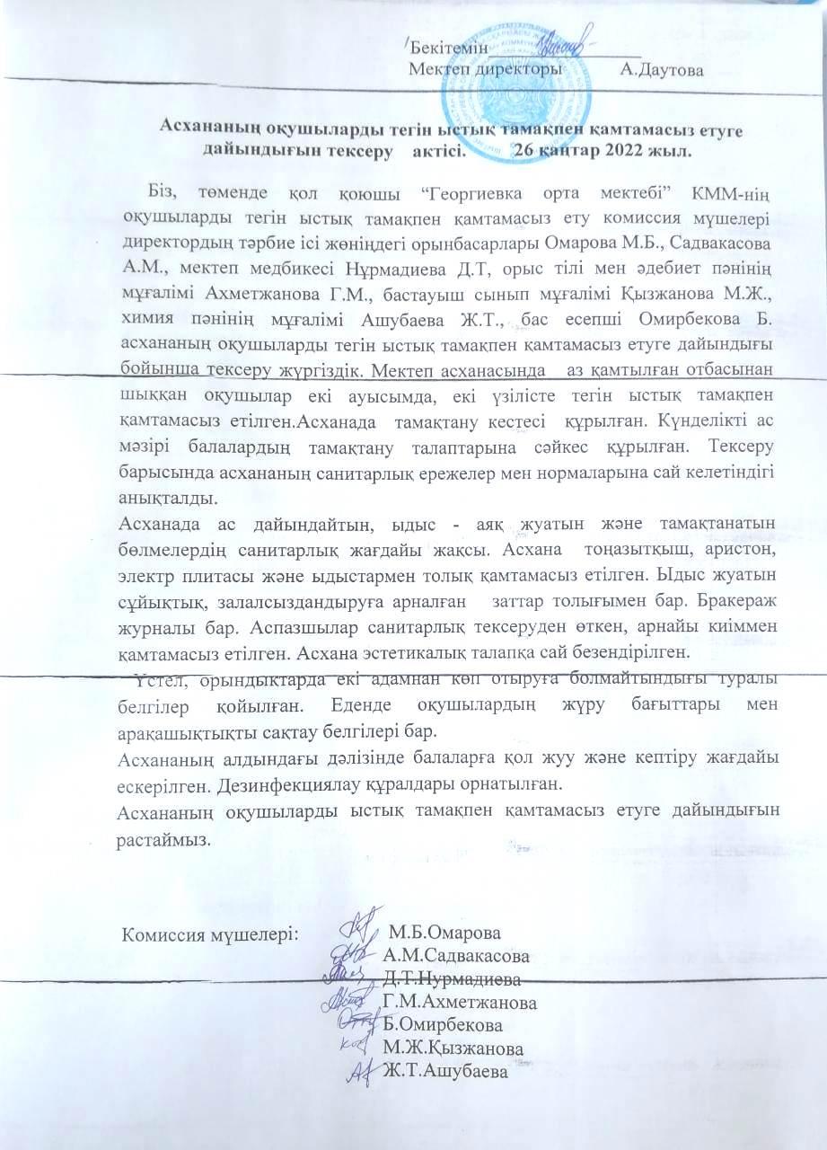 Асхананың тегін ыстық тамақпен қамтамасыз етуге дайындығын тексеру. » «Георгиевка орта мектебі» КММ