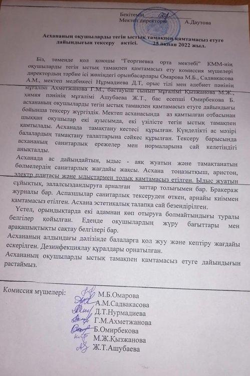 Тегін ыстық тамақпен қамтамасыз етуді тексеру актісі » «Георгиевка орта мектебі» КММ