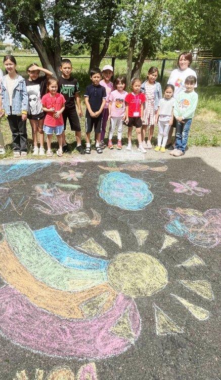 Жоспарға сәйкес "Күншуақ" жазғы лагерь балалармен "Бақытты балалық шақ" атты асфальтта түрлі-түсті бояулармен сурет салу сайысы өткізілді. Әр топтың балалары белсене қатысып, сайыстың қорытындысы бойынша "Жұлдыздар" және "Бірлік" тобы 3 орынды, "Дружба" және "Балдырған "тобы 2 орынды, "Болашақ" тобы 1 орынды иеленіп, мақтау қағаздарымен марапатталды. Әр топтың өз жоспарларына сәйкес "Жұлдыздар" тобында көңілді қимыл ойындары, "Болашақ"тобында "Күн, ауа, су - сенің нағыз достарың" атты эстафеталық жарыс, "Дружба" тобында "Біз өнерлі баламыз" атты іс-шара өткізіліп, әр бала түрлі жұмыстар жасап, шеберліктерін көрсете алды.