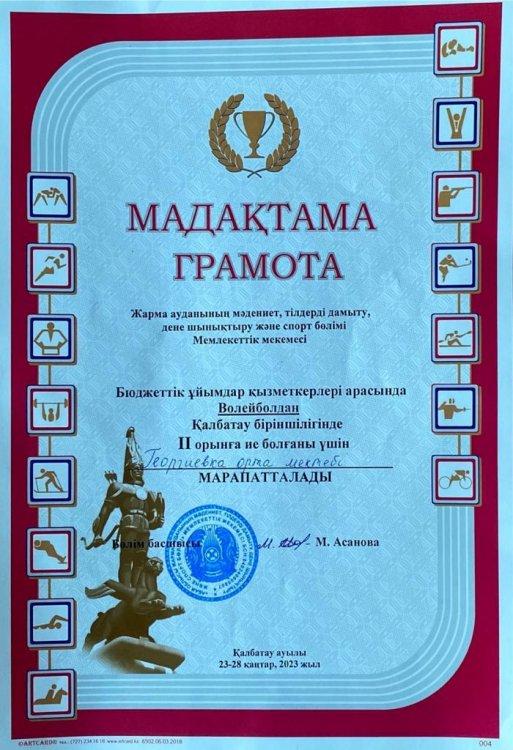 28 январь 2023 0 1 2 3 4 5 Волейболдан өткен аудан біріншілігі Бюджеттік ұйымдар қызметкерлері арасында волейболдан өткен аудан біріншілігінде "Георгиевка орта мектебі" КММ-нің командасы жүлделі ІІорынды иеленді. Құттықтаймыз!!!