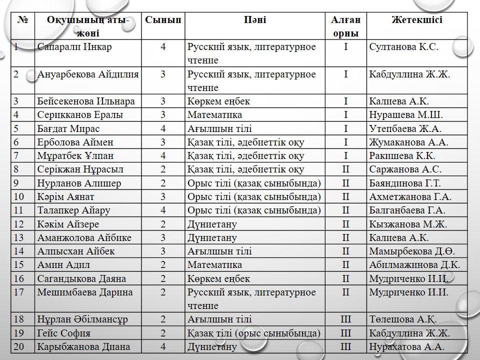 2023 жылдың 16 май күні 2-4 сынып оқушылар арасында «Балдырған» олимпиадасының аудандық кезеңі өтті. Олимпиадаға мектебімізден 25 оқушы қатысып, төмендегідей нәтиже көрсетті: