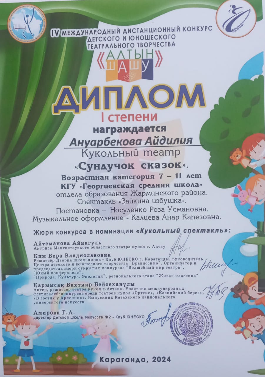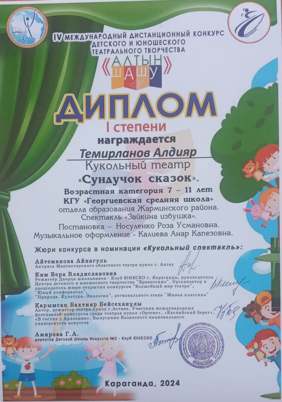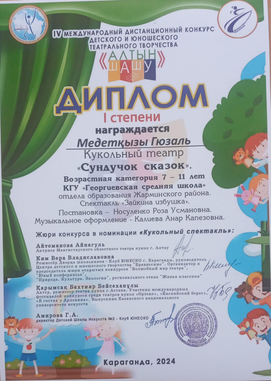 Талантты жастарды анықтау және қолдау, театр өнері саласында жаңа есімдер мен таланттарды ашу мақсатында ұйымдастырылған IV Халықаралық «Алтын шашу» балалар мен жасөспірімдер театры шығармашылығының байқауында "Қуыршақ театрының" құрамында болған 4-сынып оқушылары Аманжолова Айбике, Кабдуллина Самита, Ануарбекова Айдилия, Темирланов Алдияр, Финькова Виктория, Сериков Асанали, Медетқызы Гюзаль І ДӘРЕЖЕЛІ ДИПЛОММЕН марапатталса, Кабдуллина Самита "Лучший қосалқы рөл" ДИПЛОМ иегері атанды. Кішкентай жас таланттарымыздың алар асулары биік болсын деген тілек білдіреміз.