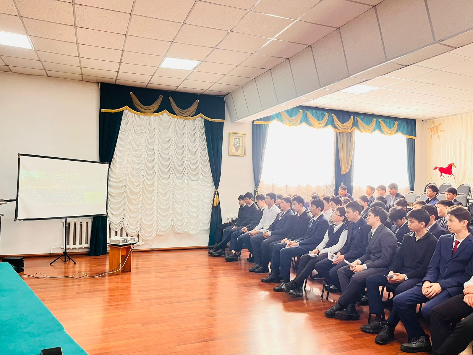 Семей қаласының 44793 әскери бөлімінің батальон командирінің орынбасары А.Байбусов пен батальон сержанты А.Нурахметов келіп, 9-11-сынып ұлдарымен кәсіптік бағдар бойынша әңгіме жүргізді. Школьникам өздерінің қызметі мен болашақ жастарға жасалған жағдайлар туралы ақпарат беріп, бейнеролик көрсетті. Қызығушылық танытқан оқушылардың сұрақтарына жауап беріп, пайдалы мәліметтермен бөлісті.