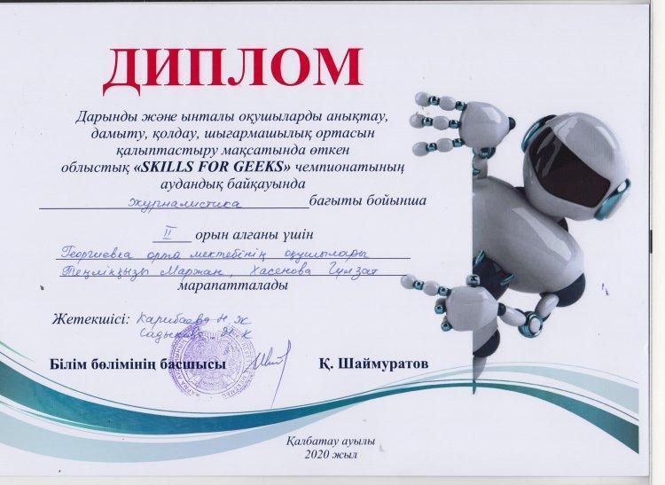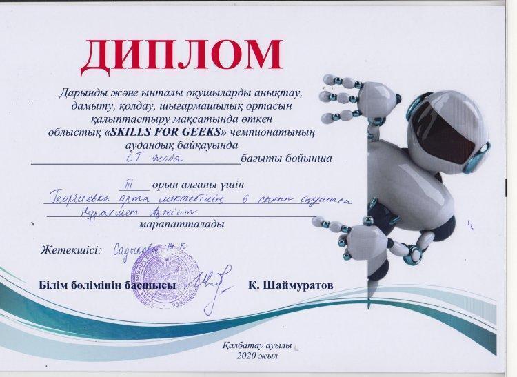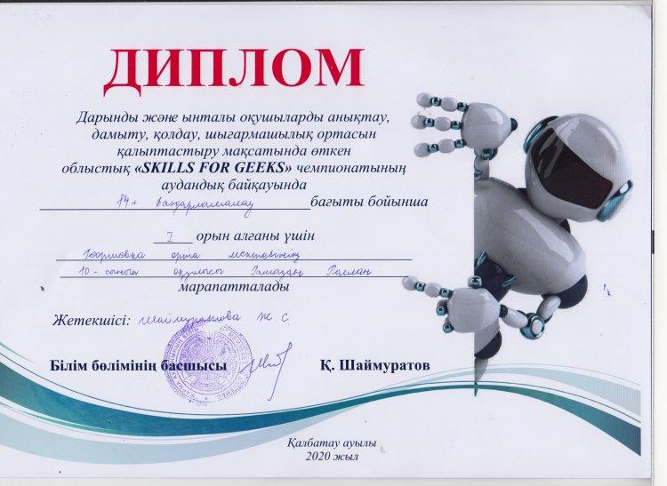 2020 жылдың 30 январь күні роботты құрастыру және бағдарламалау бойынша дарынды оқушыларды анықтау, қолдау, білім саласында ғылым мен технологияның дамуына орай оқушыларды ғылыми ізденіспен айналысуға дағдыландыру, бағыттау мақсатында «Жарма аудандық білім бөлімі» ММ-нің ұйымдастырумен облыстық «SKILLS FOR GEEKS» чемпионатының аудандық байқауы өтті. Аталған байқауға отдела образования Жарминского района КММ-нің 5-10 сынып оқушылары қатысты. Нәтижесінде «IT жоба» бағыты бойынша Нұрахмет Ақжігіт ІІІ орын, «Робототехника» бағыты бойынша Самкенов Мадияр ІІІ орын, «Журналистика» бағыты бойынша Хасенова Гүлзат пен Теңлікова Маржан ІІ орын, «3D модельдеу» бағыты бойынша Рамазан Роллан жүлделі І орынға ие болды.