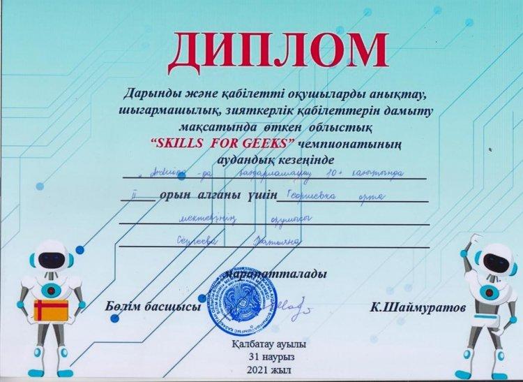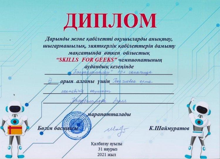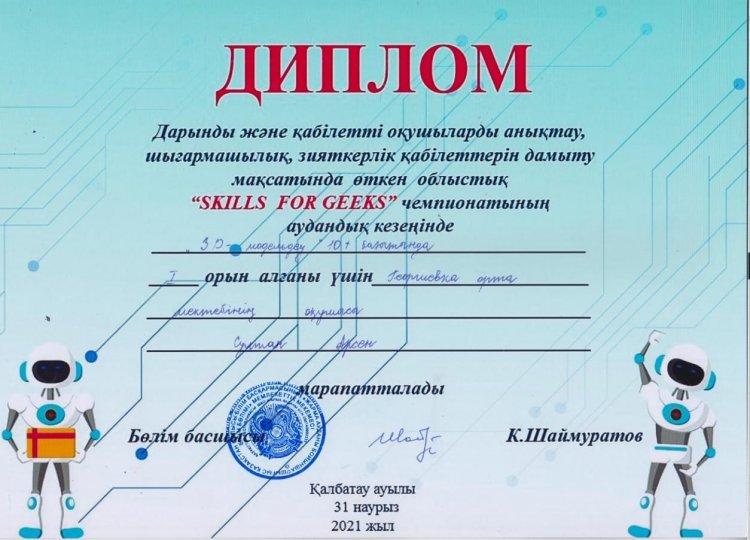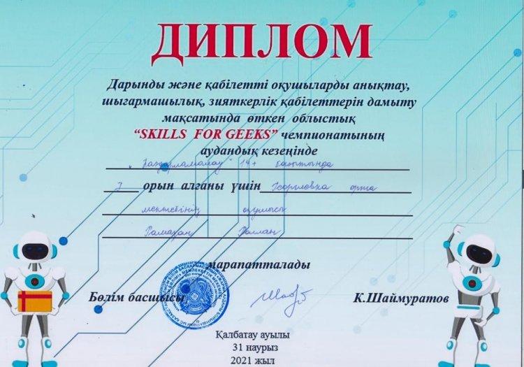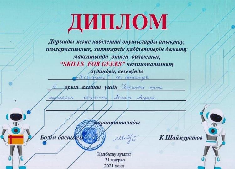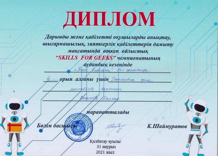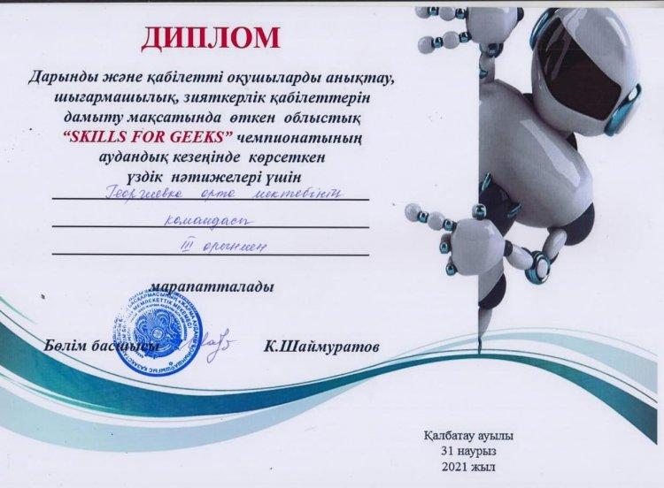 Ағымдағы жылдың 31-марты күні дарынды және қабілетті оқушыларды анықтау, шығармашылық, зияткерлік қабілеттерін дамыту мақсатында облыстық «SKILLS FOR GEEKS» чемпионатының аудандық кезеңі өтті. Атаулы чемпионатқа отдела образования Жарминского района КММ- нің оқушылары белсене қатысты. Нәтижесінде «Бағдарламалау» 10+ санатында Төлеуғалымова Анеля ІІІ орын, «Кегельринг» 10+ санатында Абжат Айдана ІІІ орын, « Танк биатлоны» 14+ санатында Оспанова Балжан ІІІ орын, «Arduino» 10+ бағытында Сергеева Татьяна ІІ орын, «3D – модельдеу» 10+ бағытында Султан Арсен мен «Бағдарламалау» 14+ бағытында Рамазан Роллан жүлделі І орынға ие болды. Аудандық кезеңінде көрсеткен үздік нәтижелері үшін мектеп командасы жүлделі ІІІ орынды иеленді. Жетекшілері Ж.С.Шаймуратова, Ж.К.Садыкова.