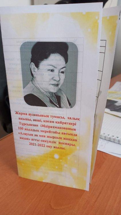 Жарма ауданының тумасы, халық ақыны, әнші, қоғам қайраткері Тұрсынхан Әбдірахманованың 100 жылдық мерейтойы аясында «Алауын ән мен жырдың жаққан ақын» атты онкүндіктің ашылуын ұйымдастырды. 9"В" сынып оқушылары әр сыныпқа онкүндіктің бағдарламасы құрылған брошюралар таратып, ақын жайлы қысқаша мәлімет беріп өтті.
