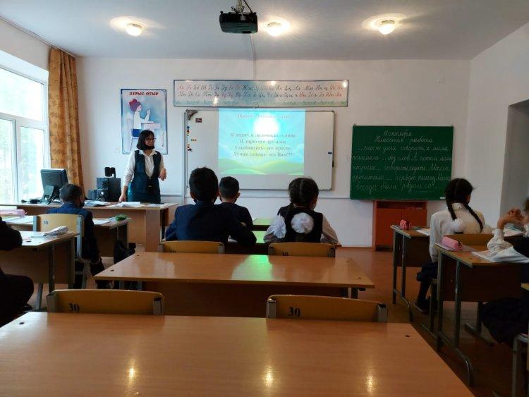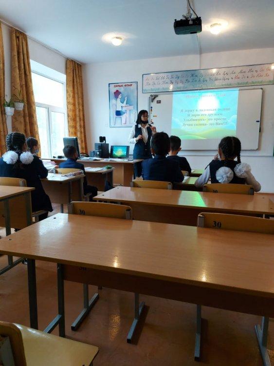 В 4 «Б» классе Баяндинова Гульжан Тургазиновна провела урок на тему «Доброта – навеки украшение человека». Урок прошёл на высоком методическом уровне. Все задания соответствовали теме урока. На протяжении всего урока шла активная работа, осуществлялась обратная связь. Ученики читали по ролям, вставляли местоимения, собирали пословицу, знакомились с новыми словами, определяли вид текста, составляли синквейн, проводили взаимооценивание. Учащиеся показали отличные знания.